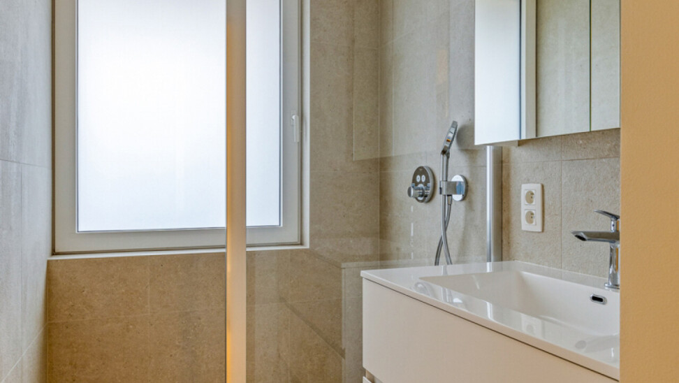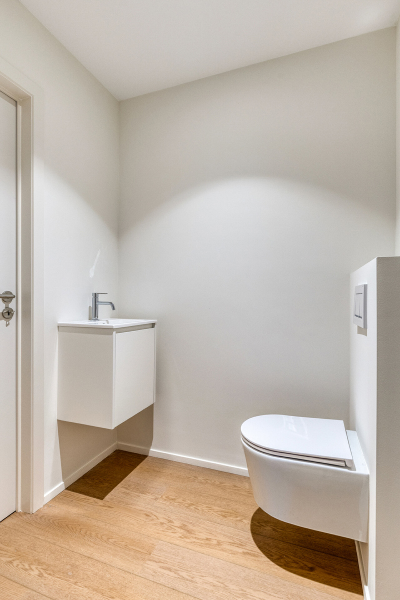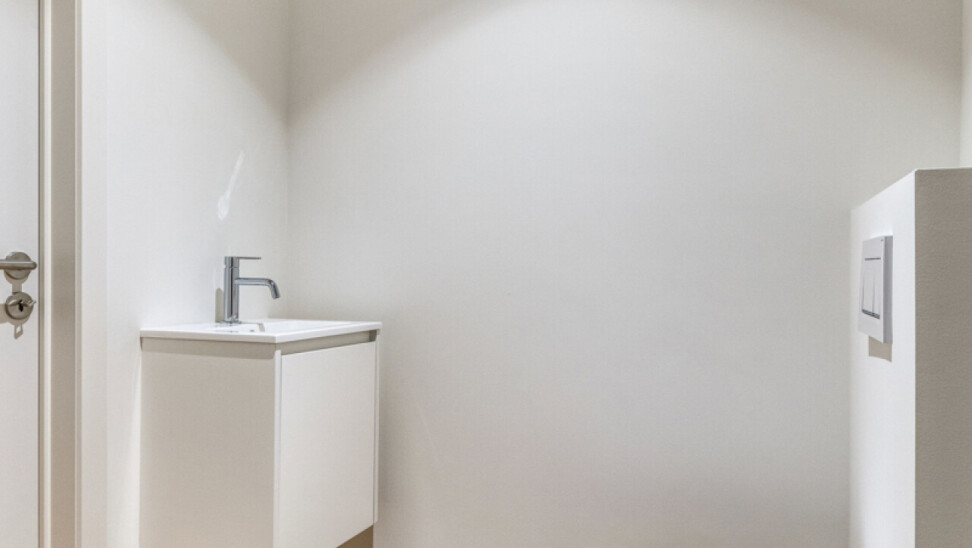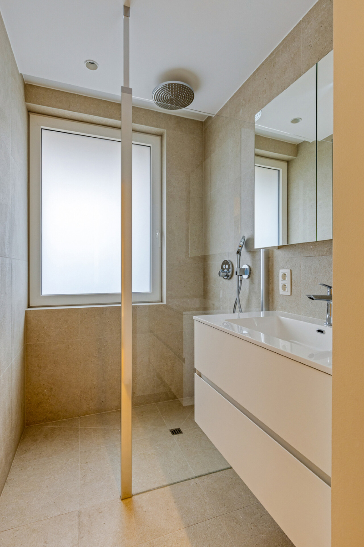 We betreden het appartement langs de centrale inkomhal. Langs de rechterzijde bevindt zich de toilet met aansluitend een badkamer voorzien van lavabo en inloopdouche. Verder zijn er langs deze zijde 2 slaapkamers aanwezig.