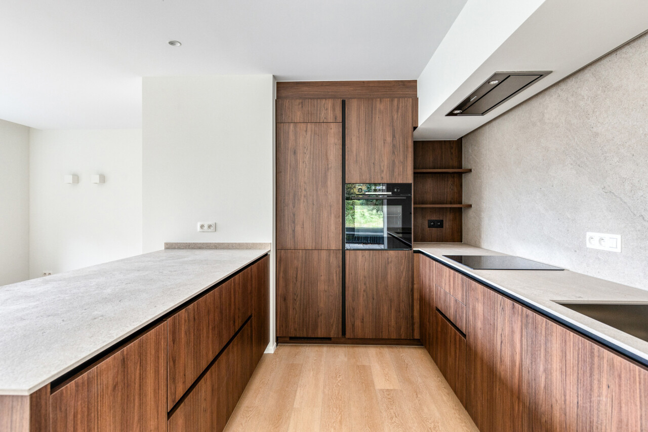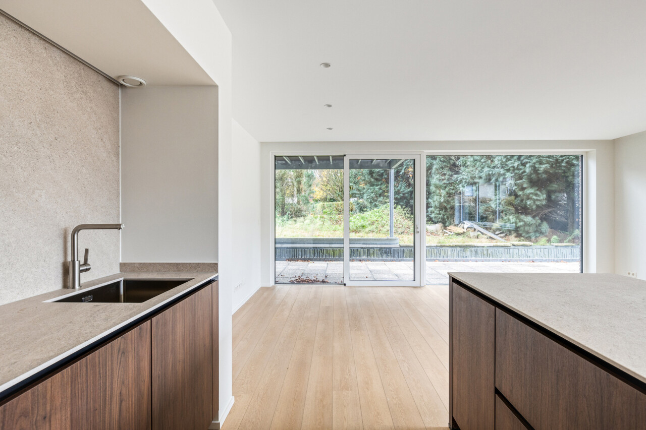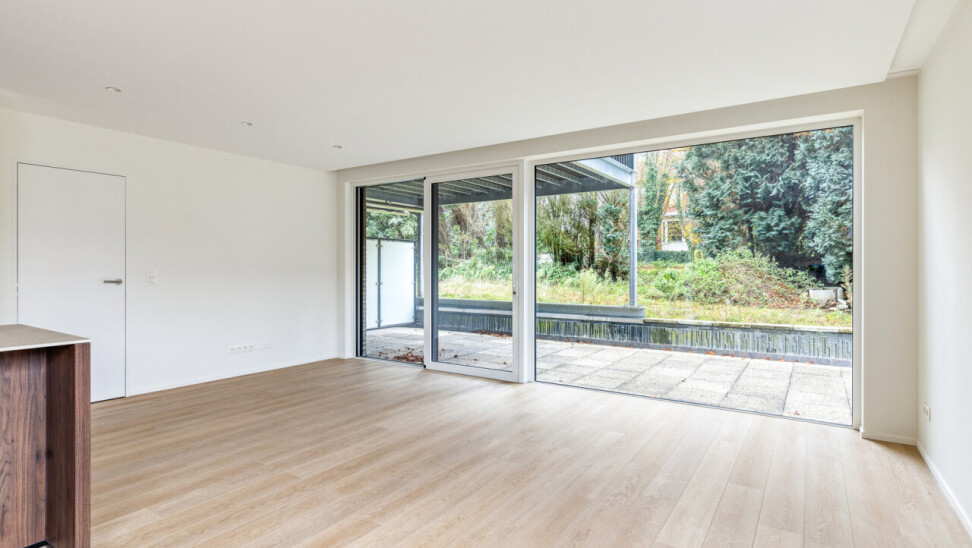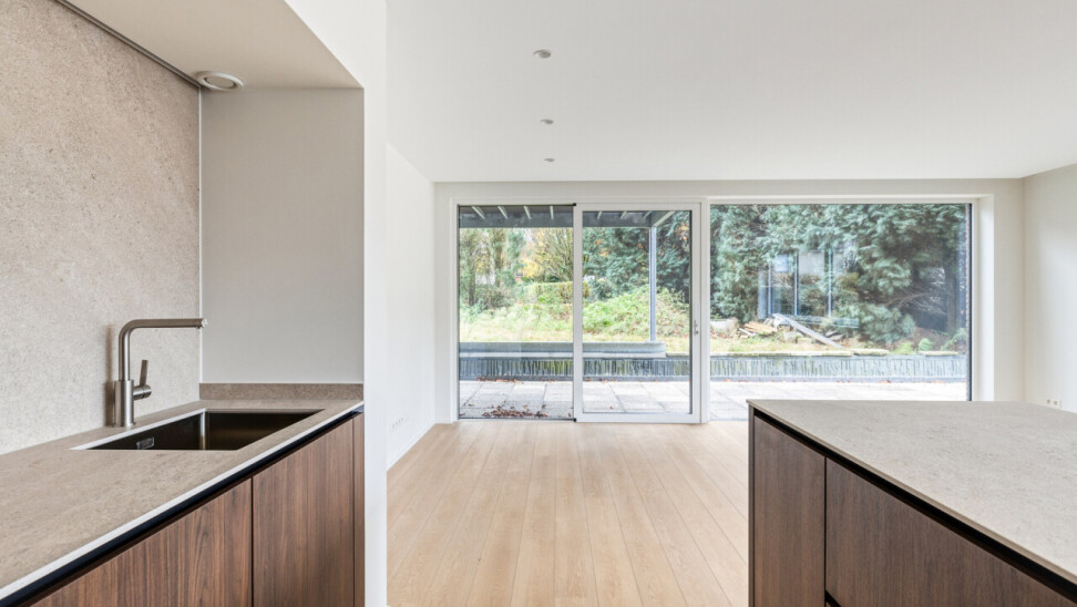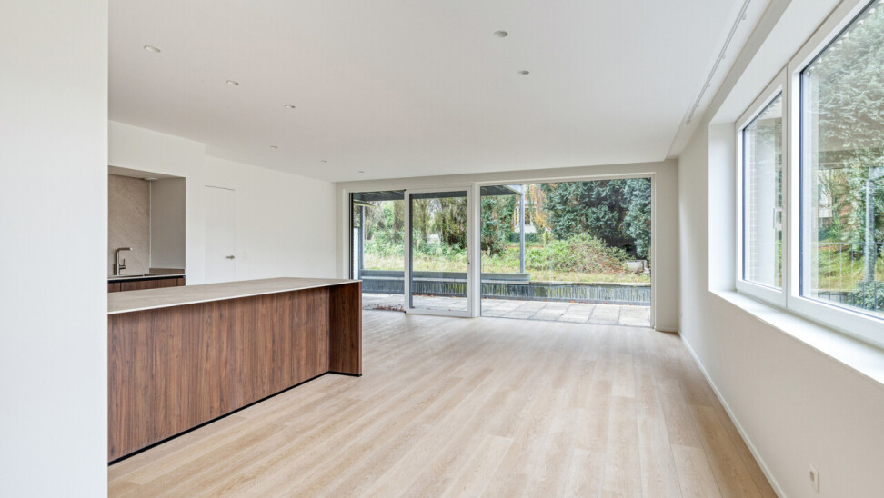Langs de linkerzijde bevindt zich de zeer ruime leefruimte en open keuken. De keuken is volledig op maat gemaakt en voorzien van alle inbouwtoestellen die je nodig hebt. Naast de keuken ligt een handige bergruimte (met aansluitingen voor wasmachine en droogkast). Aansluitend aan de leefruimte is er een ruim overdekt terras (36m2) en tuin aanwezig.