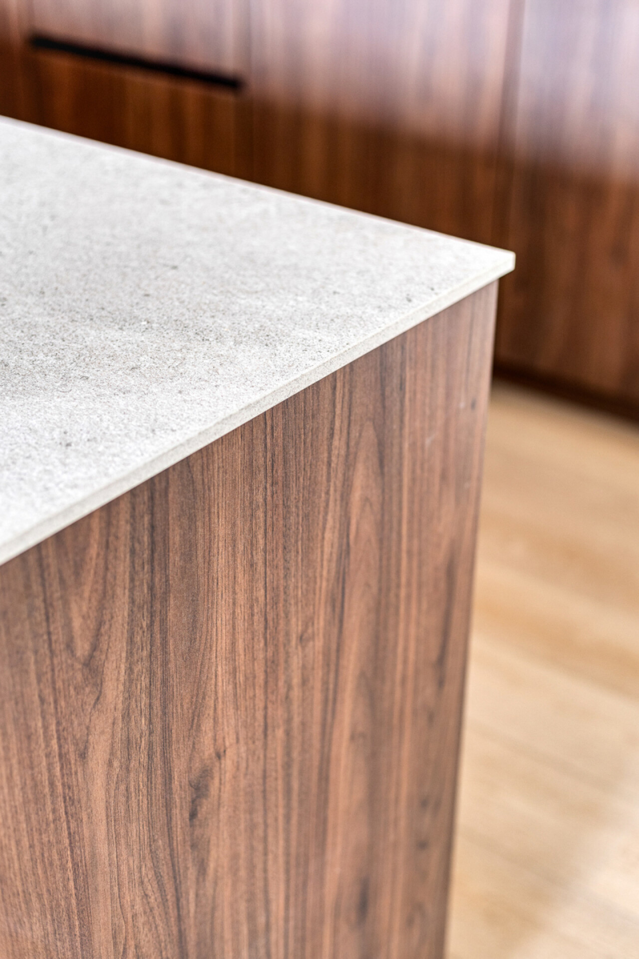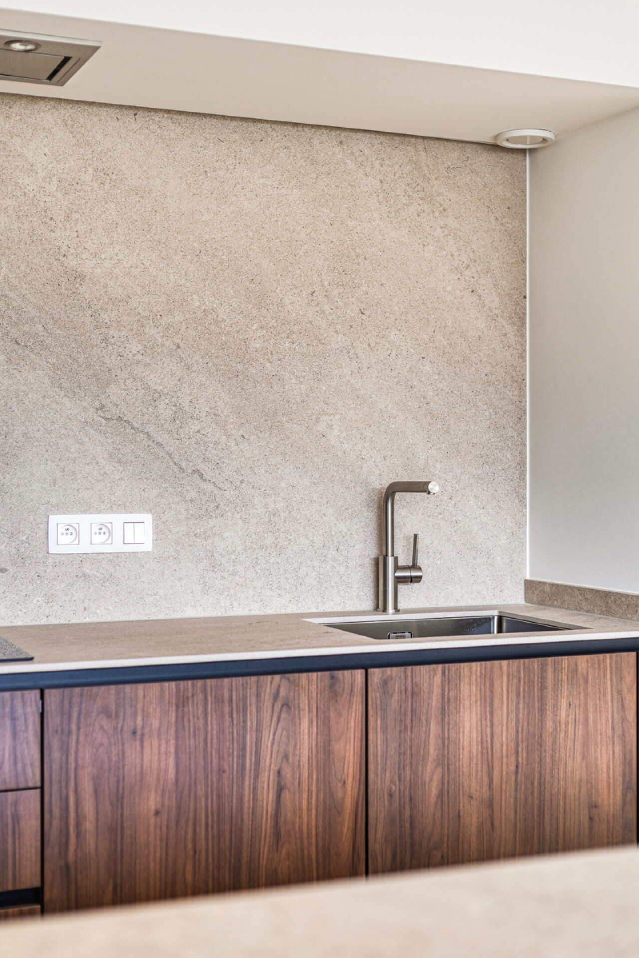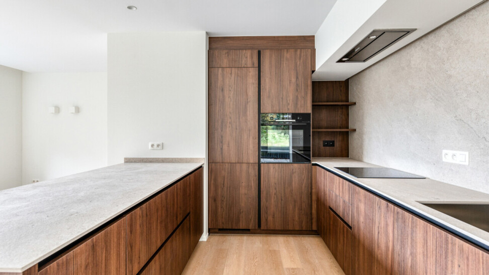 Langs de linkerzijde bevindt zich de zeer ruime leefruimte en open keuken. De keuken is volledig op maat gemaakt en voorzien van alle inbouwtoestellen die je nodig hebt. Naast de keuken ligt een handige bergruimte (met aansluitingen voor wasmachine en droogkast). Aansluitend aan de leefruimte is er een ruim overdekt terras (36m2) en tuin aanwezig.