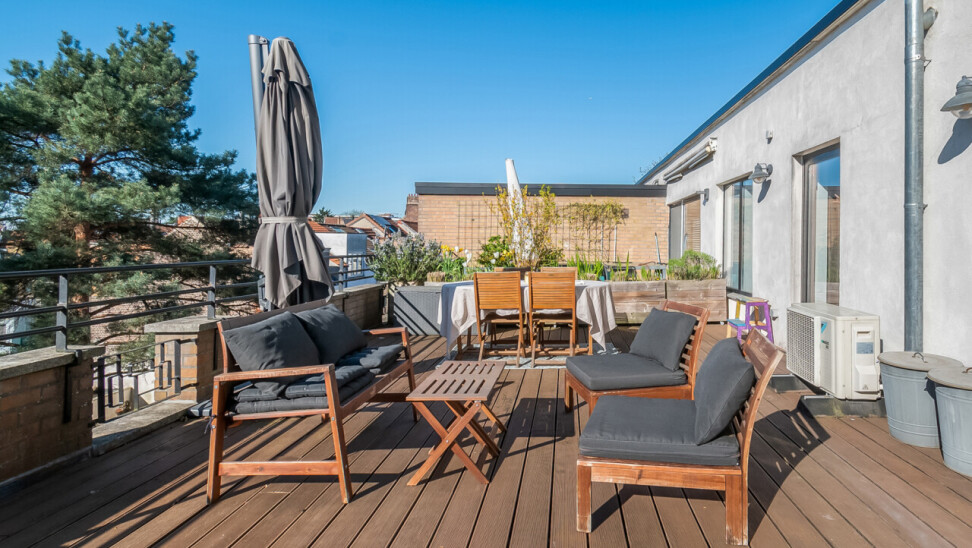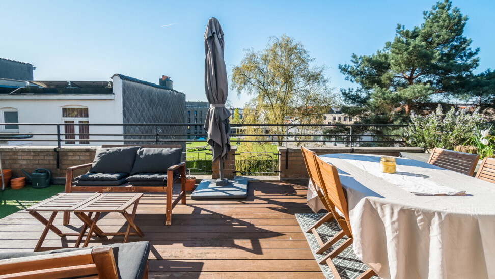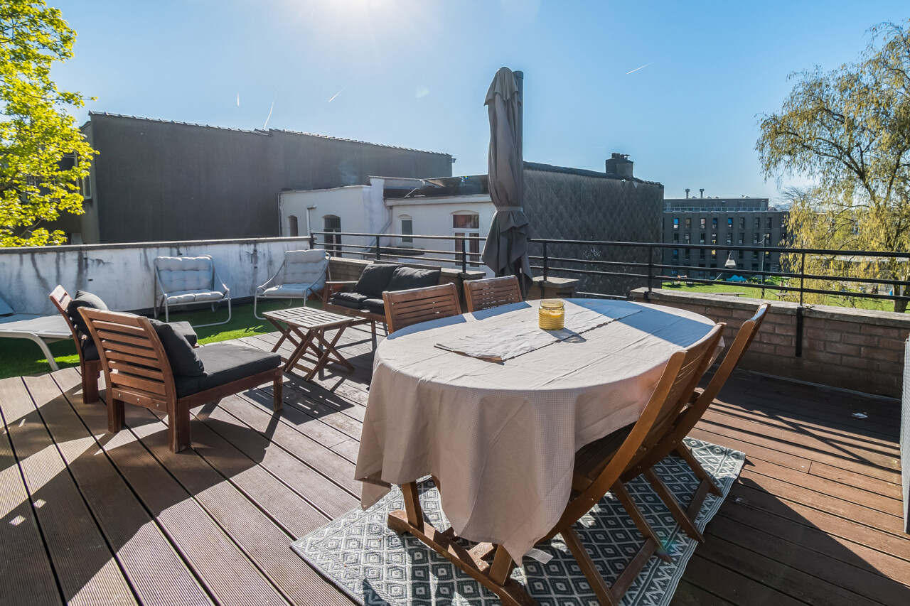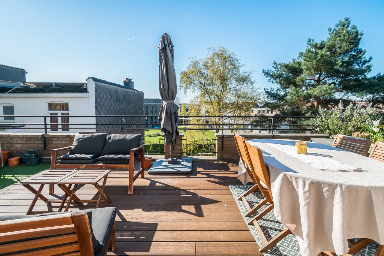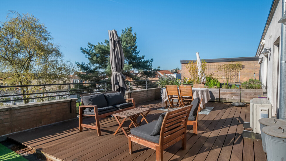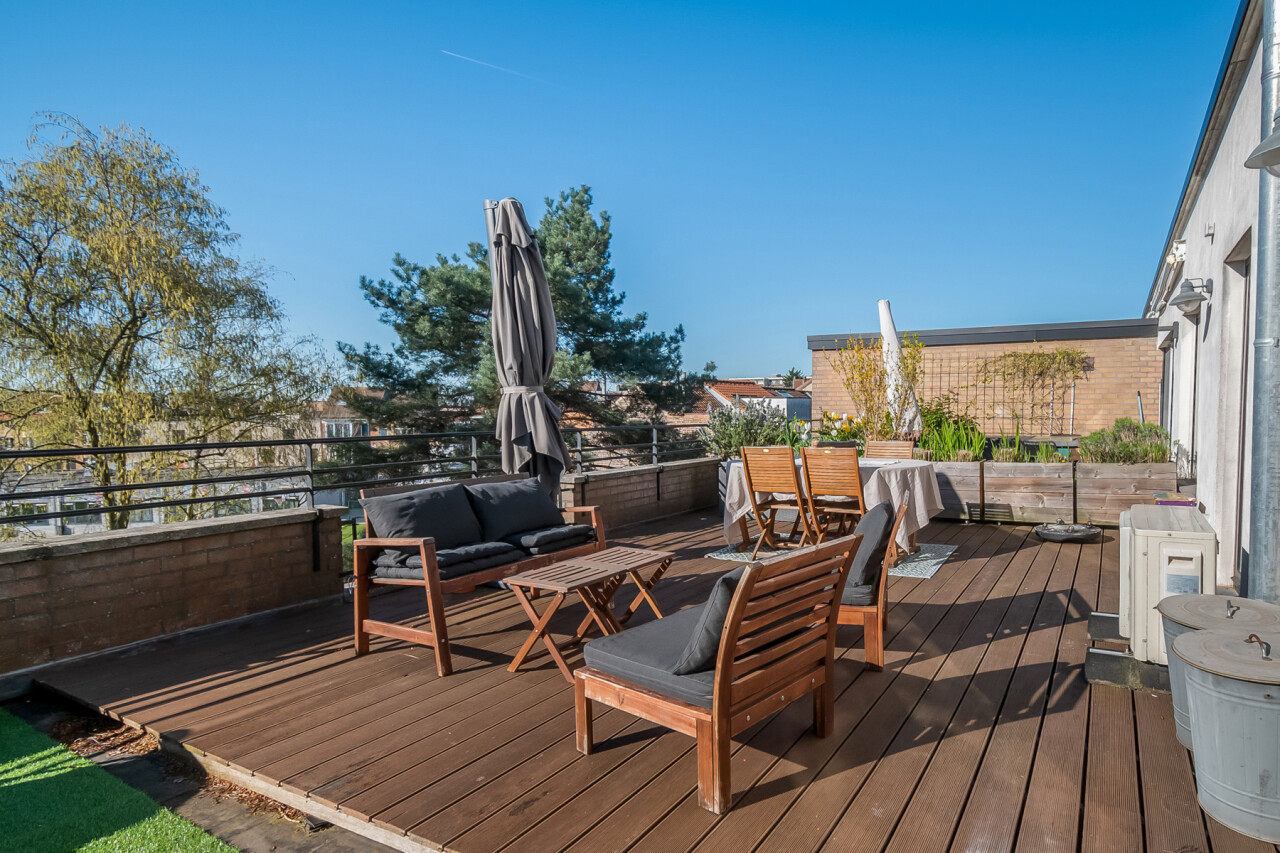 Vanuit de leefruimte heeft u rechtstreeks toegang tot dé absolute troef van dit appartement: het prachtige, ruime zuid-georiënteerde terras, waar u de hele dag kan genieten van zon en rust.