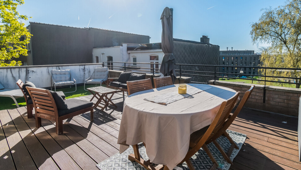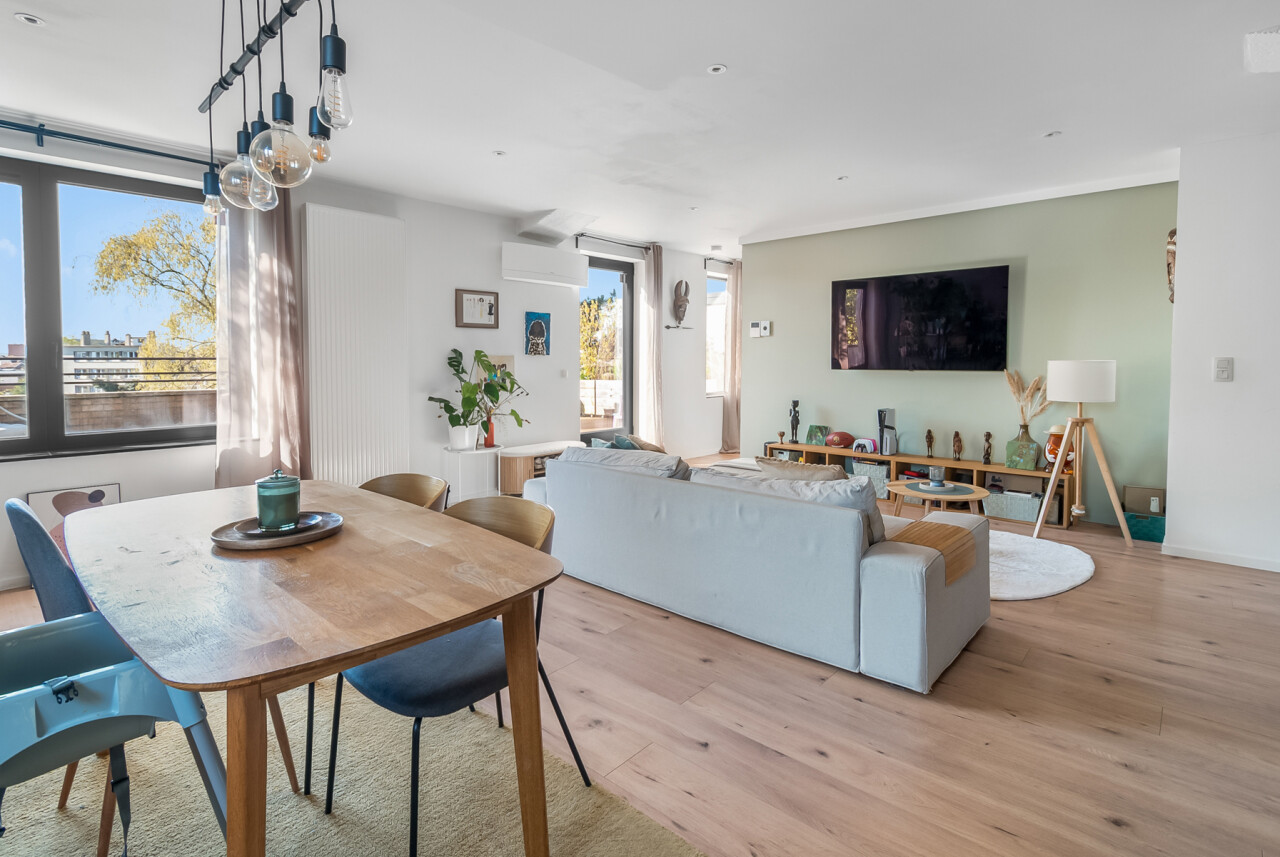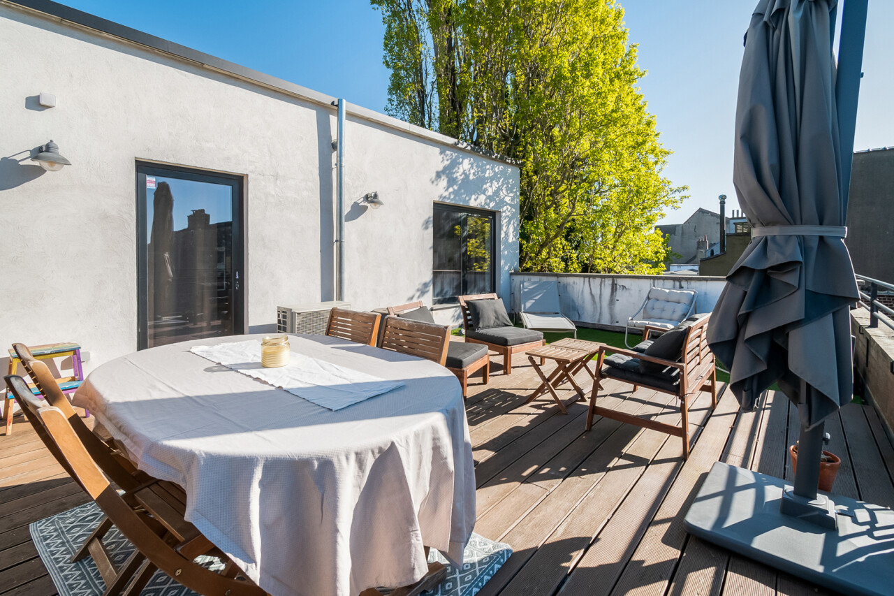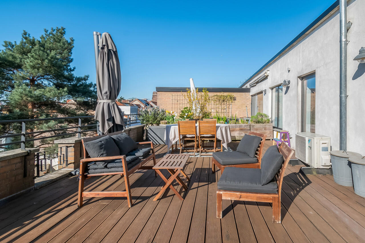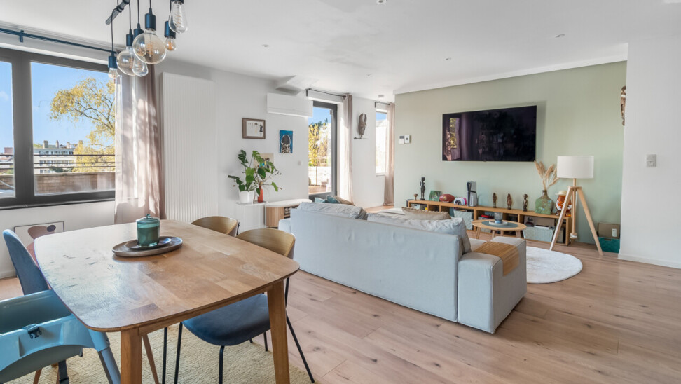 Vanuit de leefruimte heeft u rechtstreeks toegang tot dé absolute troef van dit appartement: het prachtige, ruime zuid-georiënteerde terras, waar u de hele dag kan genieten van zon en rust.
