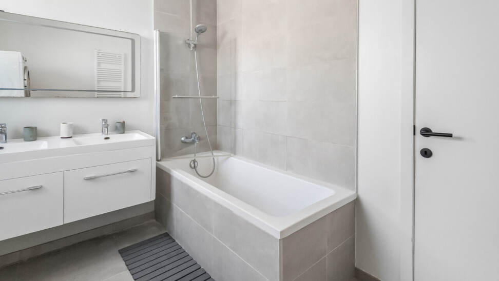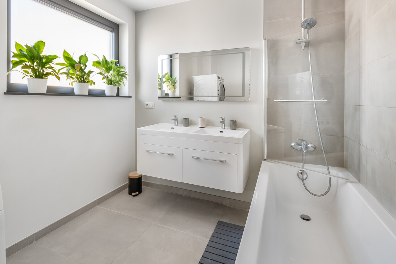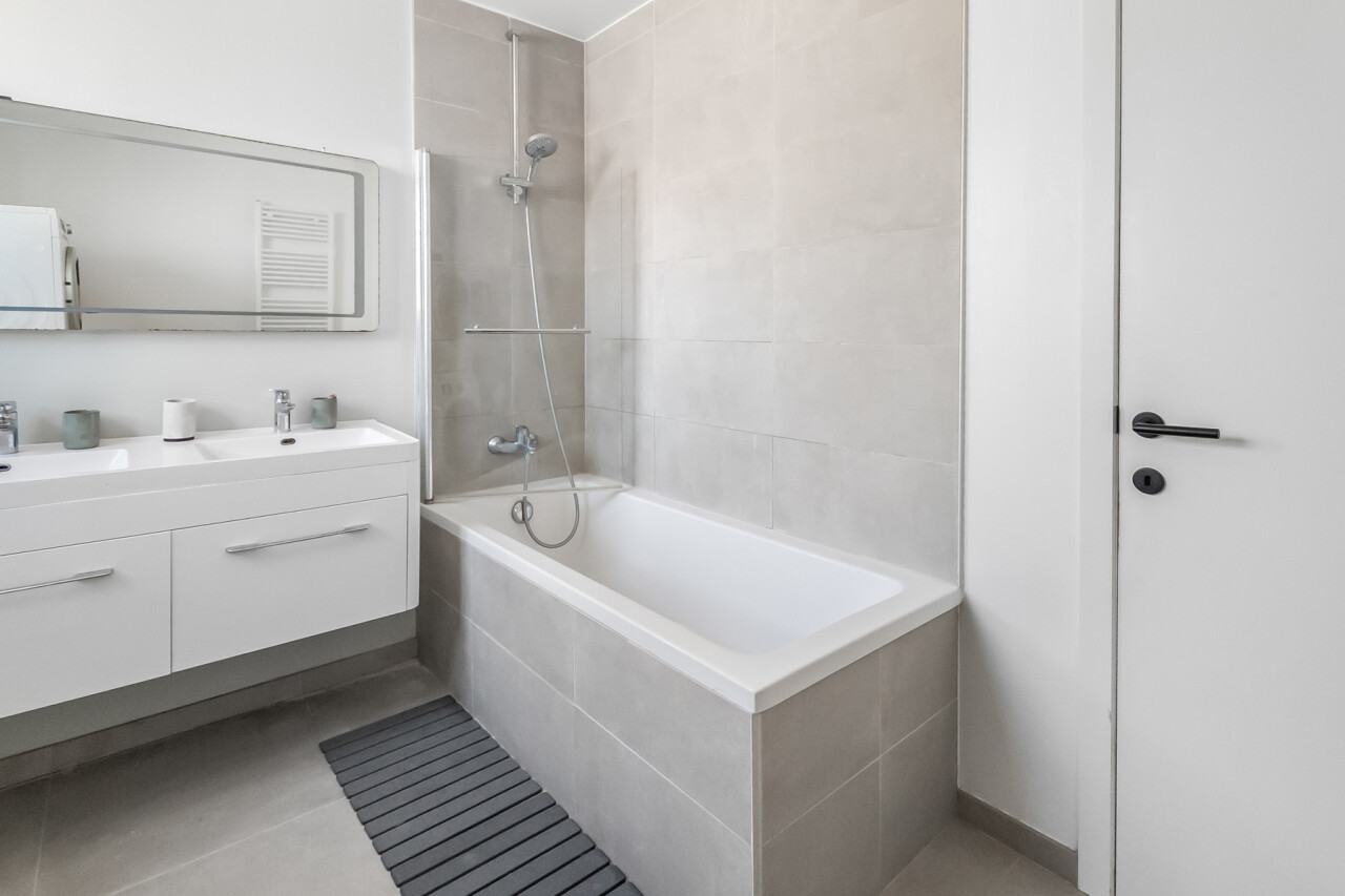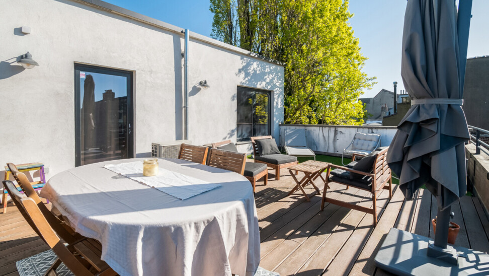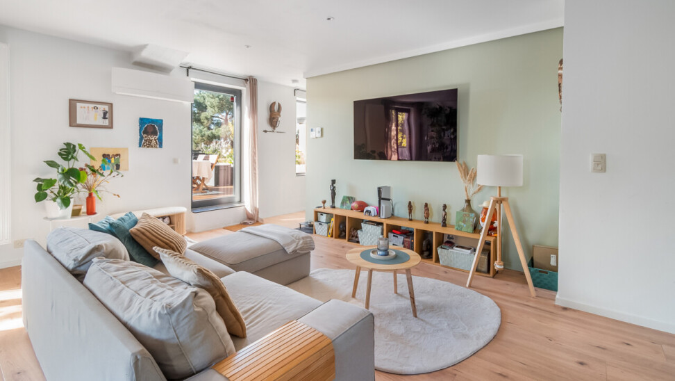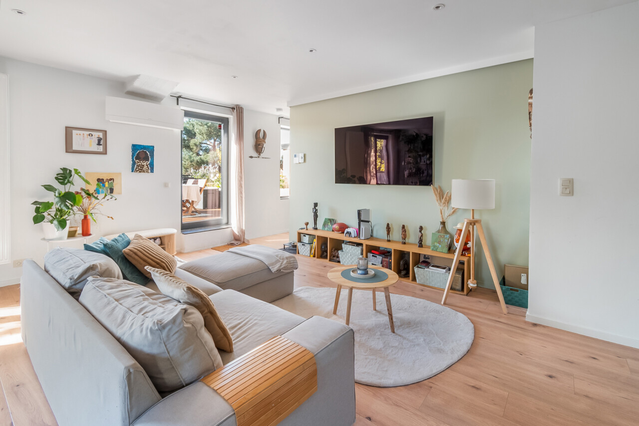 Vanuit de leefruimte heeft u rechtstreeks toegang tot dé absolute troef van dit appartement: het prachtige, ruime zuid-georiënteerde terras, waar u de hele dag kan genieten van zon en rust.