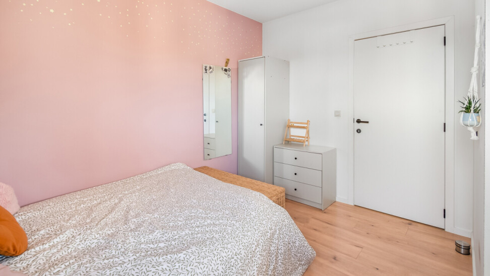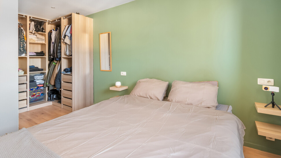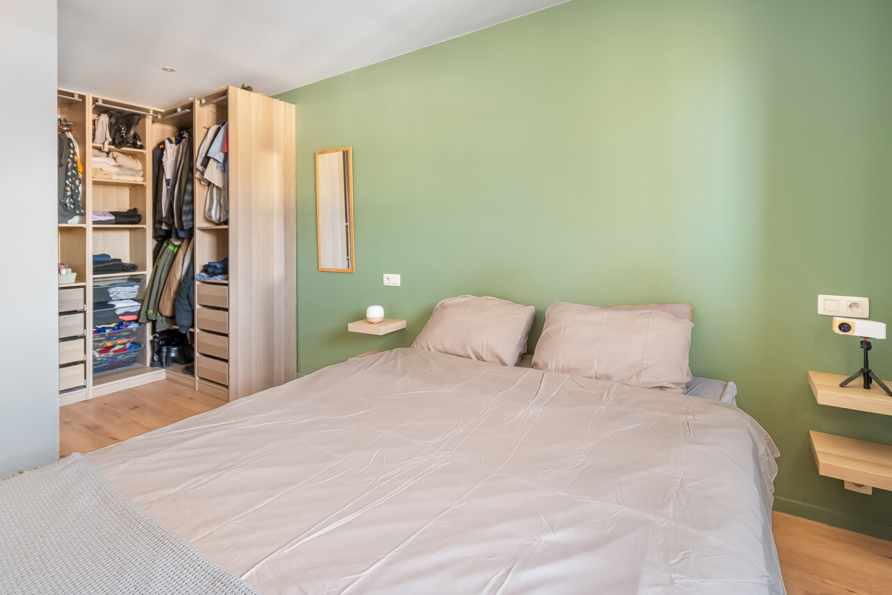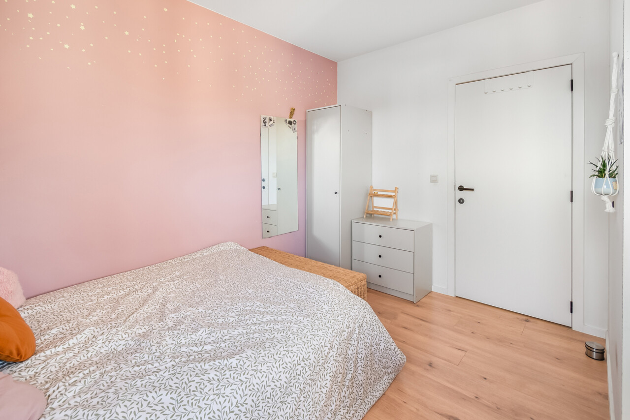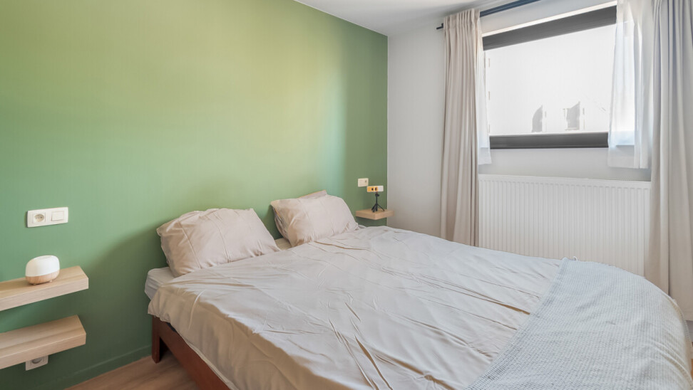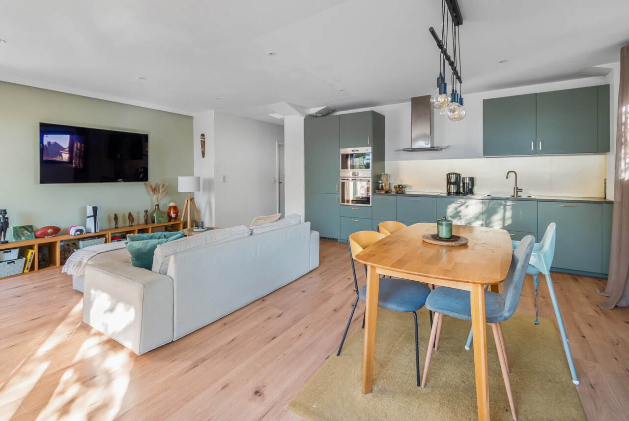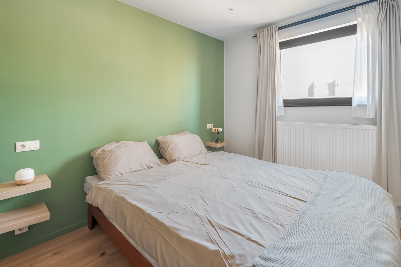 U betreedt het appartement via de ruime en lichtrijke leefruimte met open keuken, uitgerust met alle nodige toestellen. Centraal in het appartement bevindt zich de nachthal die toegang geeft tot een afzonderlijk gastentoilet, twee volwaardige slaapkamers en een ruime badkamer met natuurlijk licht.
