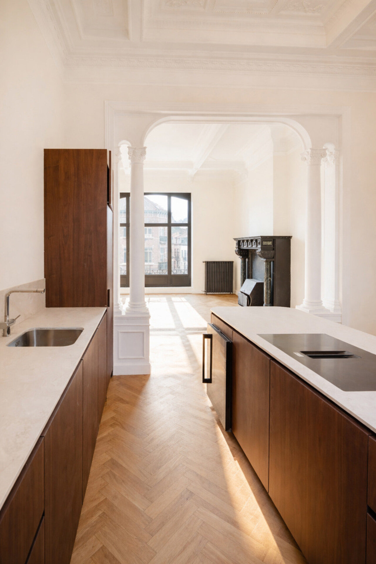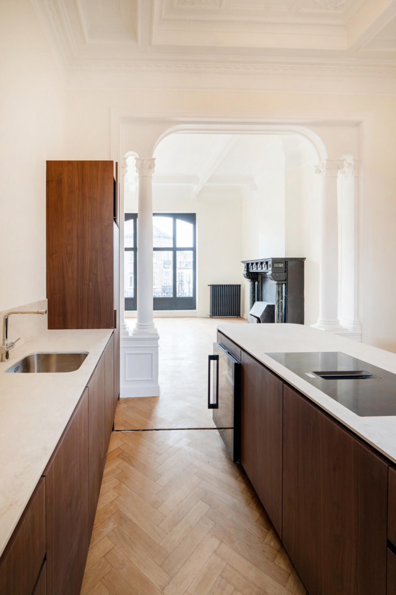 Wat dit appartement extra bijzonder maakt, zijn de authentieke elementen die met zorg bewaard en gerestaureerd werden. De originele houten balken, sierlijke gietijzeren radiatoren en verfijnde moulures versterken de unieke charme en het karakter van het appartement.