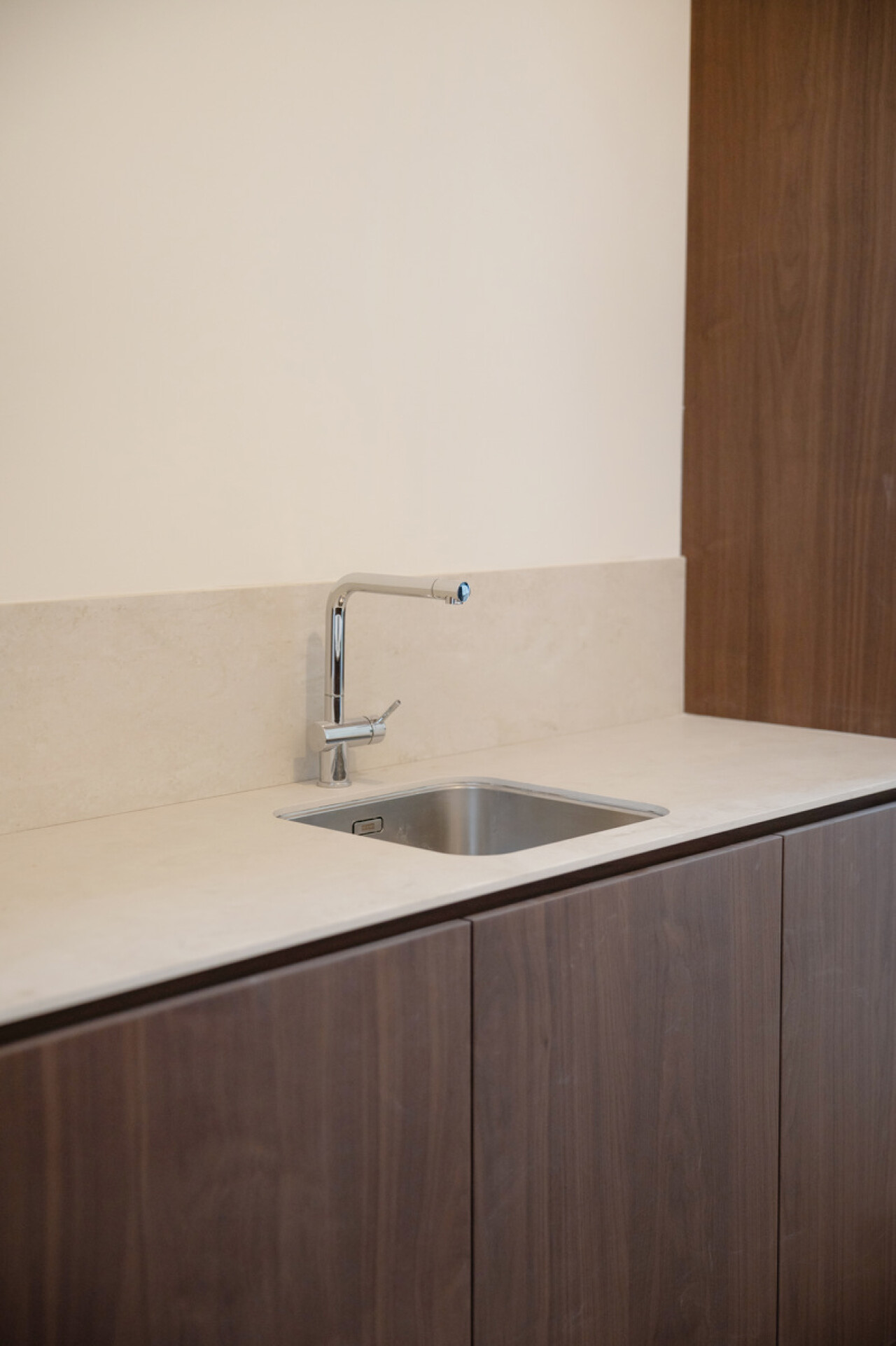U betreedt het appartement via een ruime en uitnodigende inkomhal. Rechtstreeks doorlopend komt u in de lichtrijke leefruimte, die dankzij de grote raampartijen baadt in natuurlijk licht. Aansluitend bevindt zich de volledig uitgeruste keuken met kwalitatieve toestellen van het merk AEG — ideaal voor wie graag kookt.