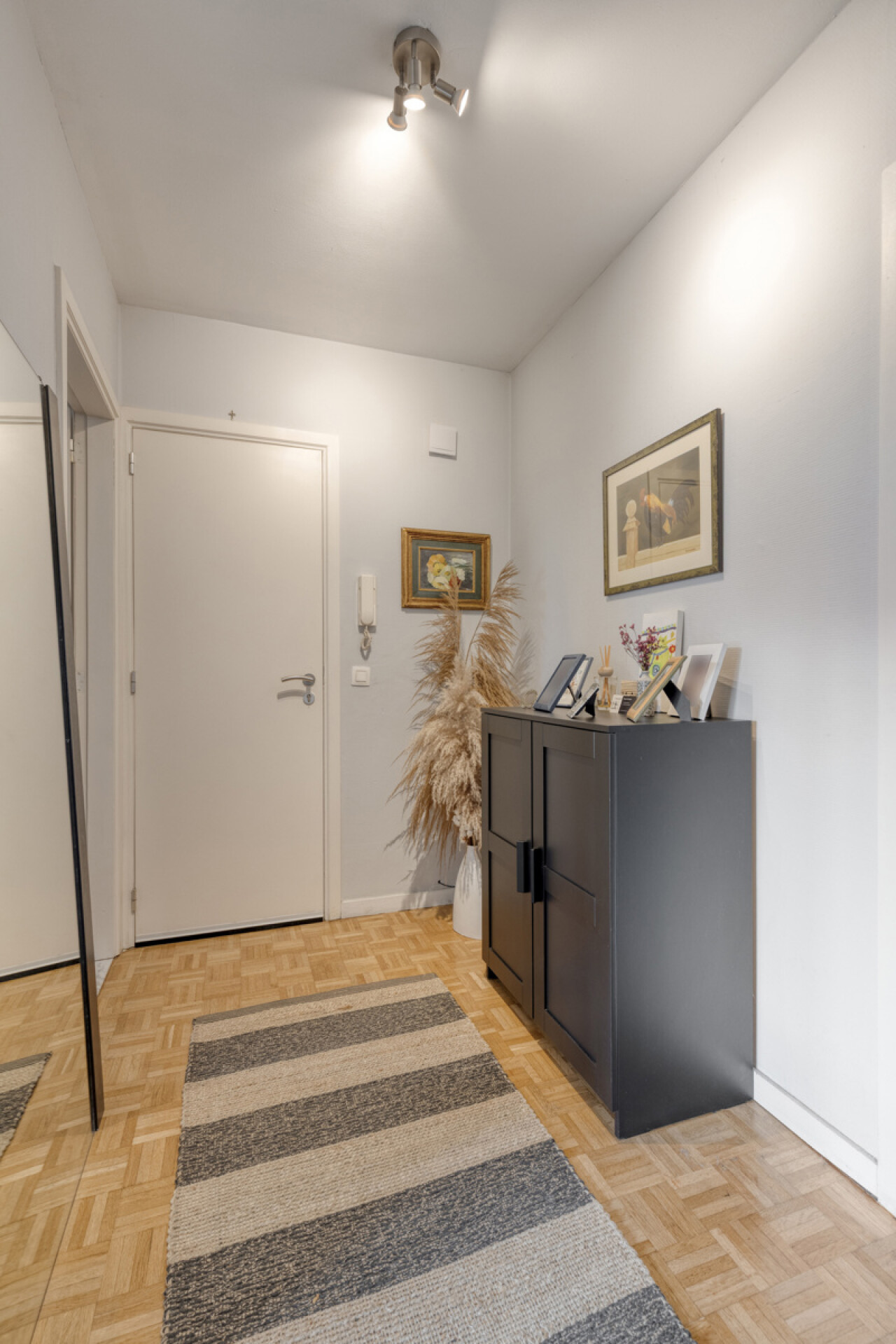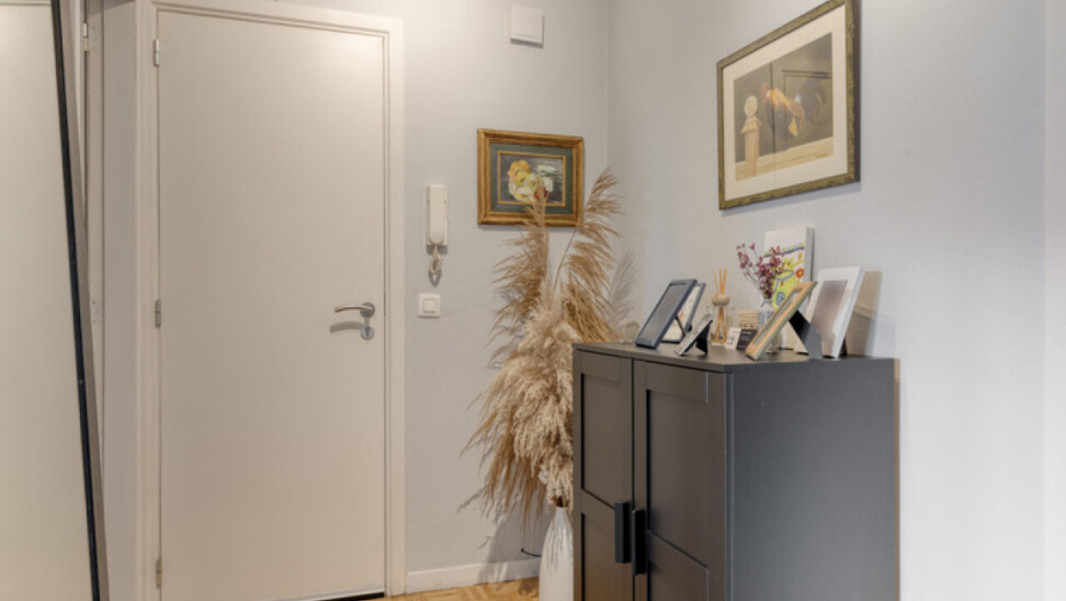 Het appartement bevindt zich op de derde verdieping en combineert een rustige woonomgeving met een uitstekende bereikbaarheid. We betreden het appartement langs de inkomhal, die als centraal punt dienst doet in het appartement.