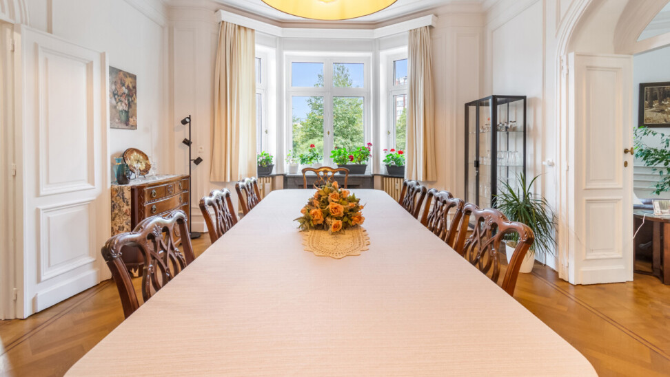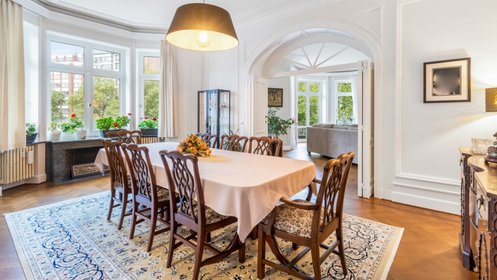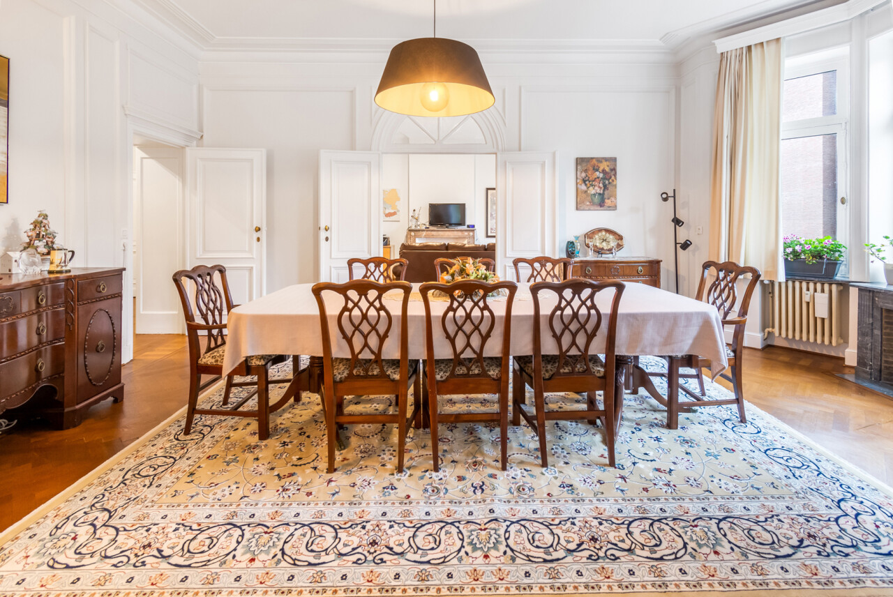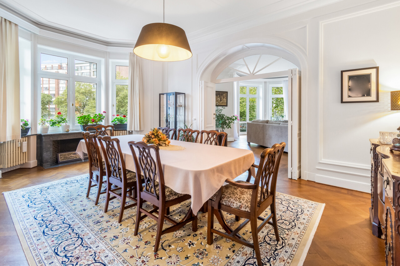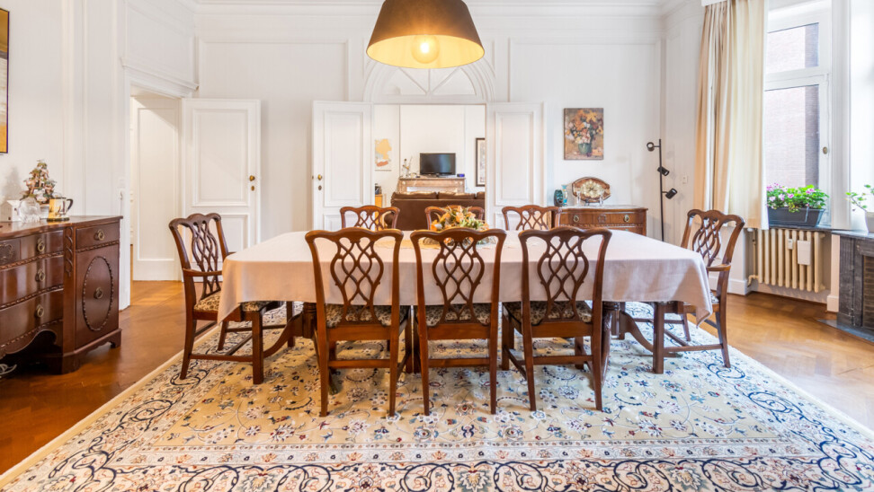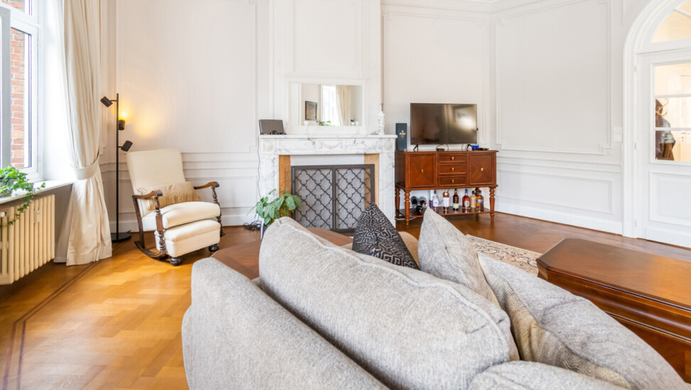 De royale leefruimte is een ware oase van licht, met hoge plafonds en grote raampartijen. De open indeling zorgt voor een harmonieuze flow tussen de leefruimte, de eetkamer en de gezellige bureauruimte, die perfect dienst kan doen als leeshoek of werkplek.