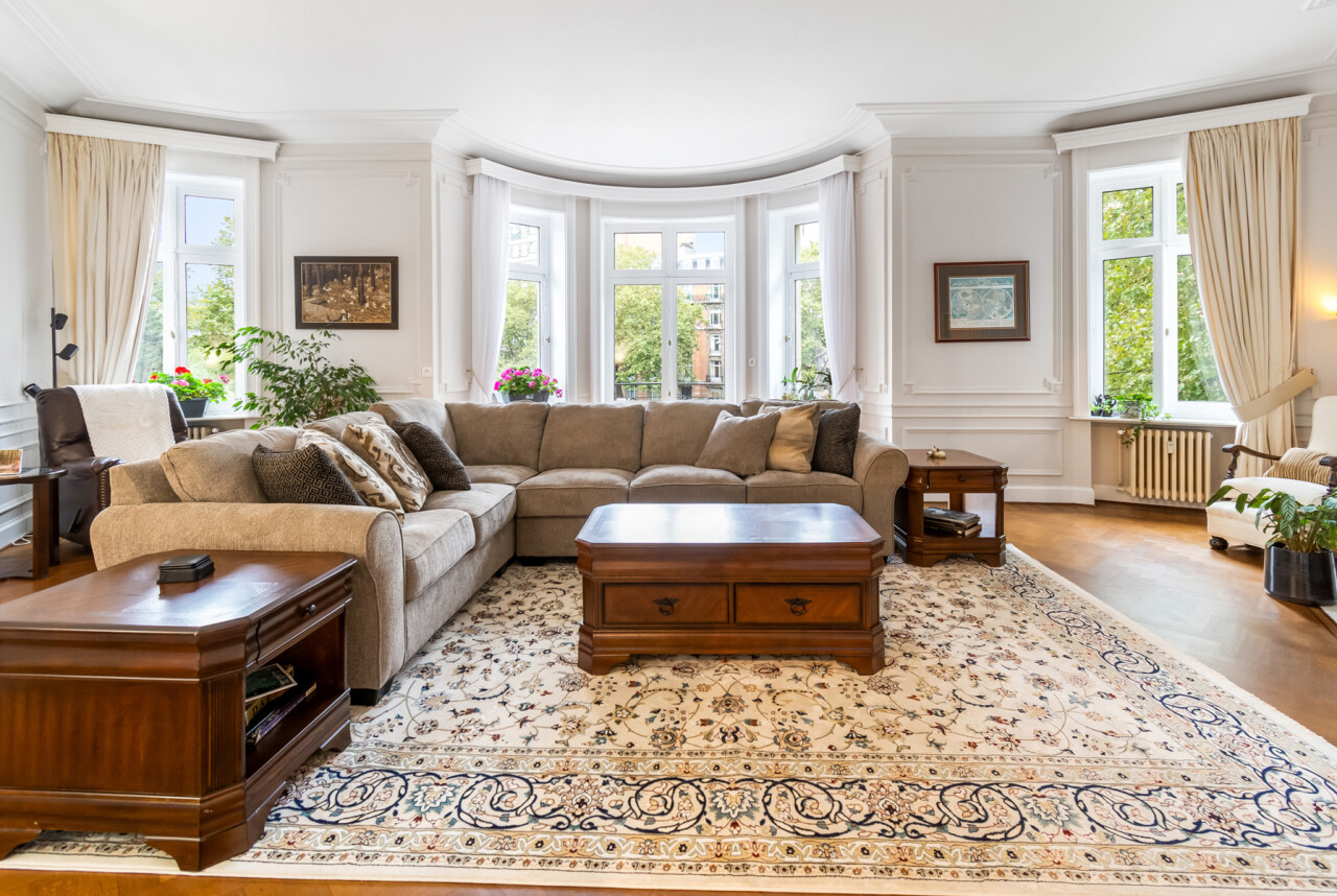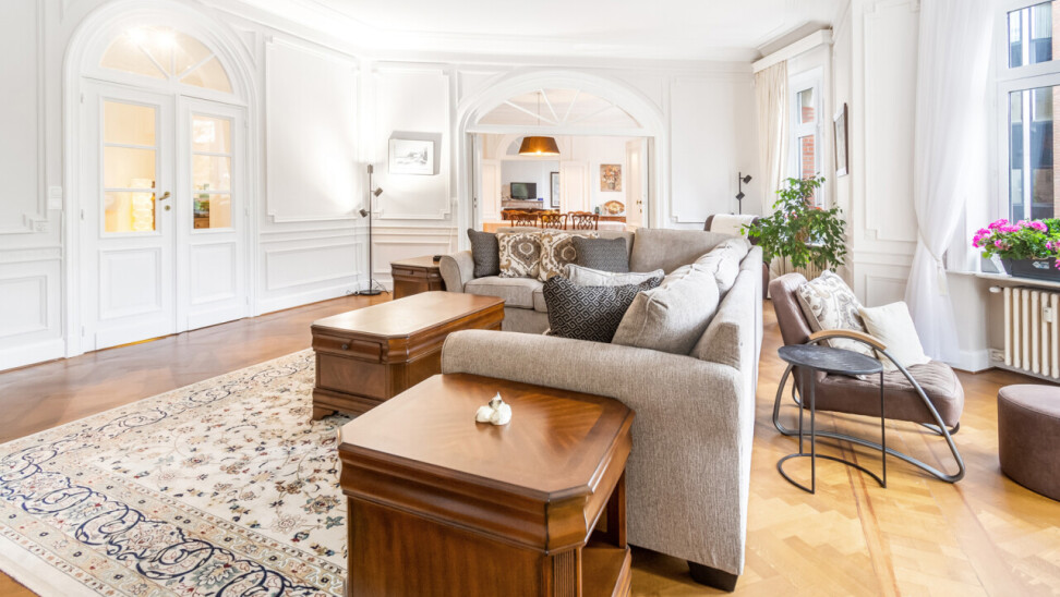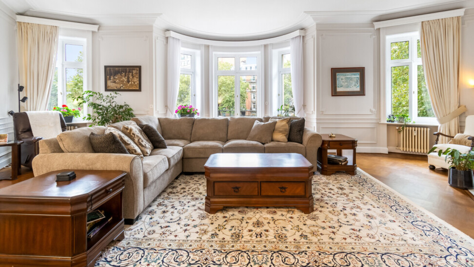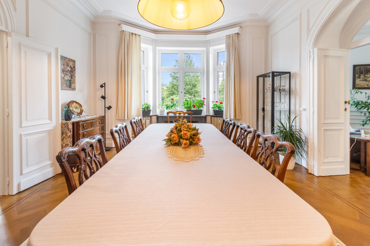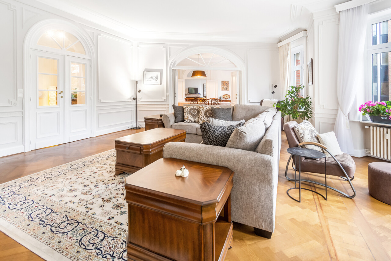 De royale leefruimte is een ware oase van licht, met hoge plafonds en grote raampartijen. De open indeling zorgt voor een harmonieuze flow tussen de leefruimte, de eetkamer en de gezellige bureauruimte, die perfect dienst kan doen als leeshoek of werkplek.