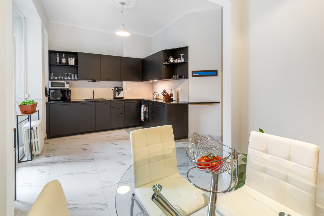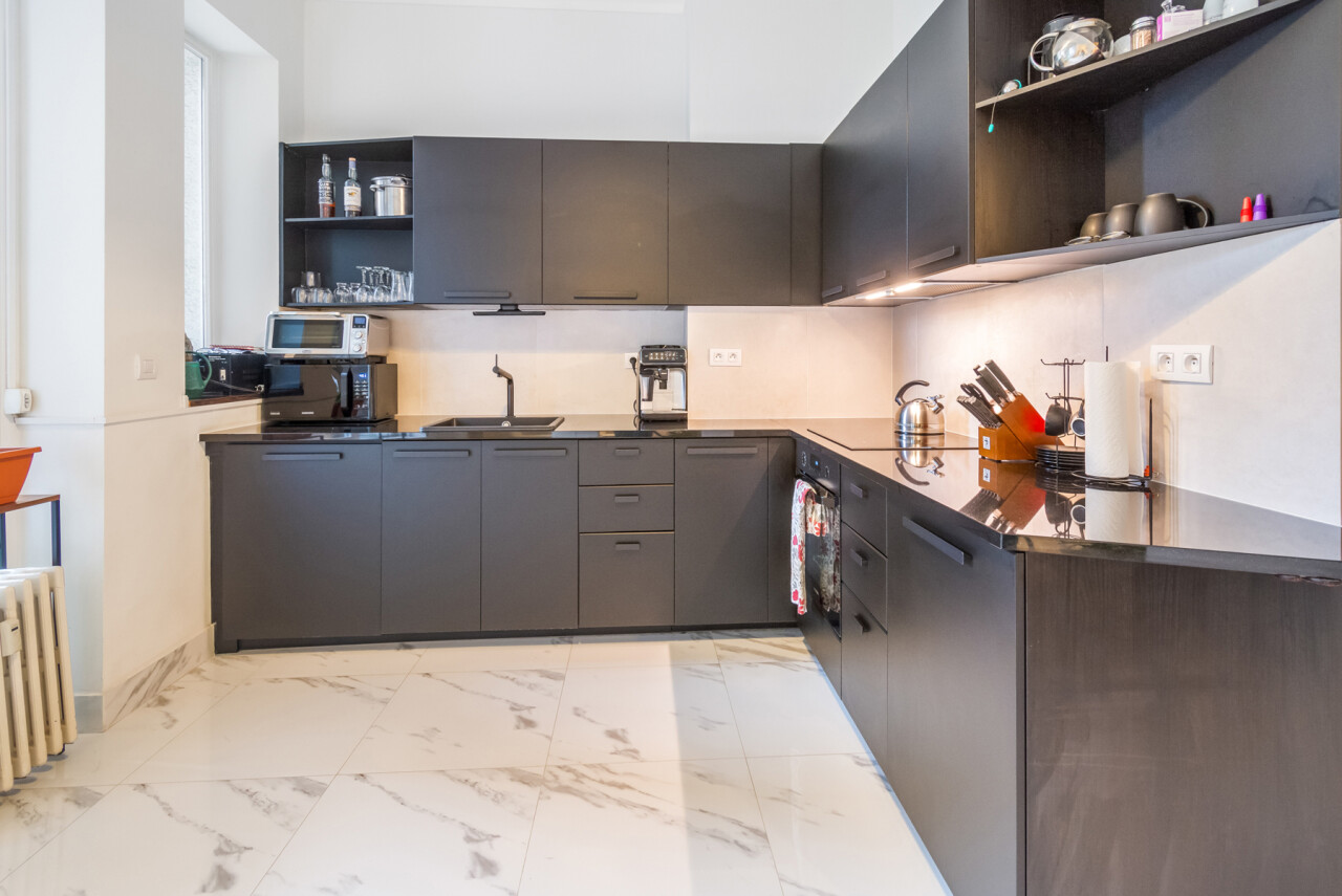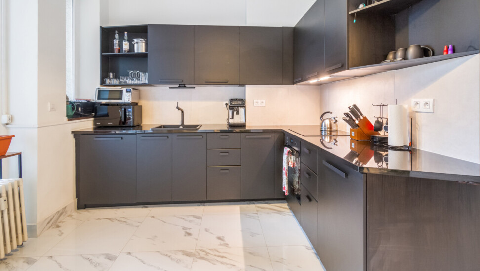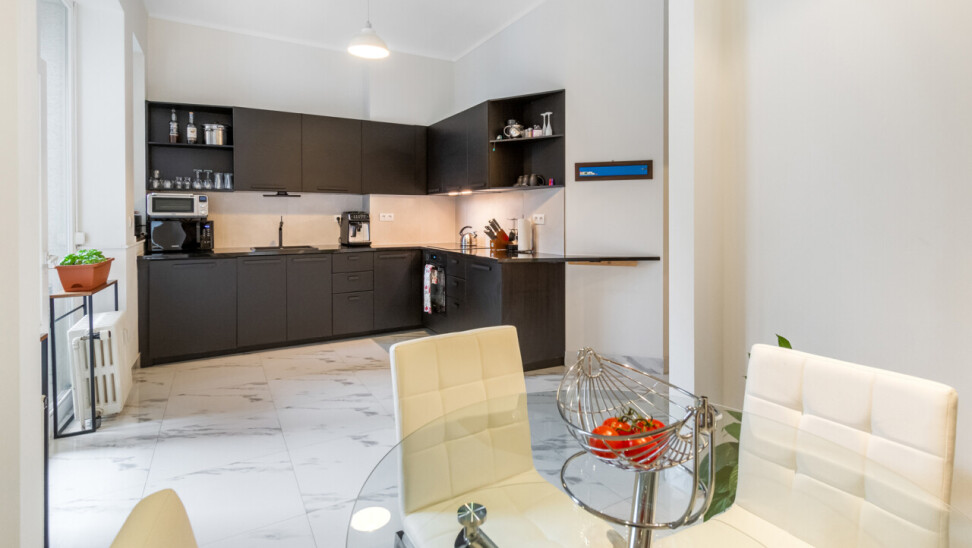 Aan de linkerkant ligt de volledig vernieuwde keuken, voorzien van hoogwaardige apparatuur en afgewerkt met oog voor detail. De keuken is voorzien van een ruime ontbijthoek, met aangrenzend een terras.