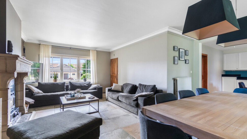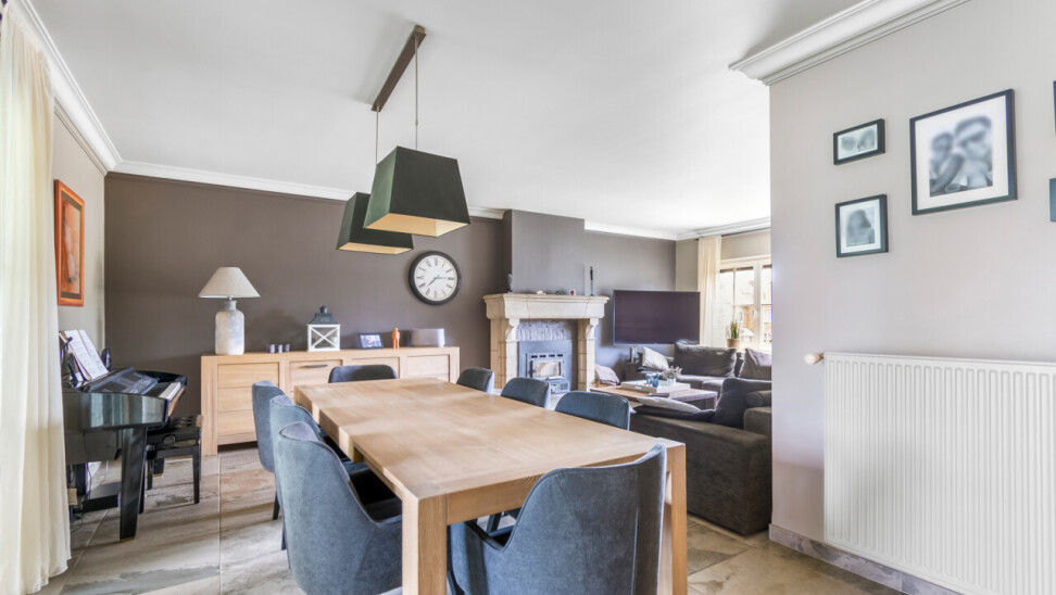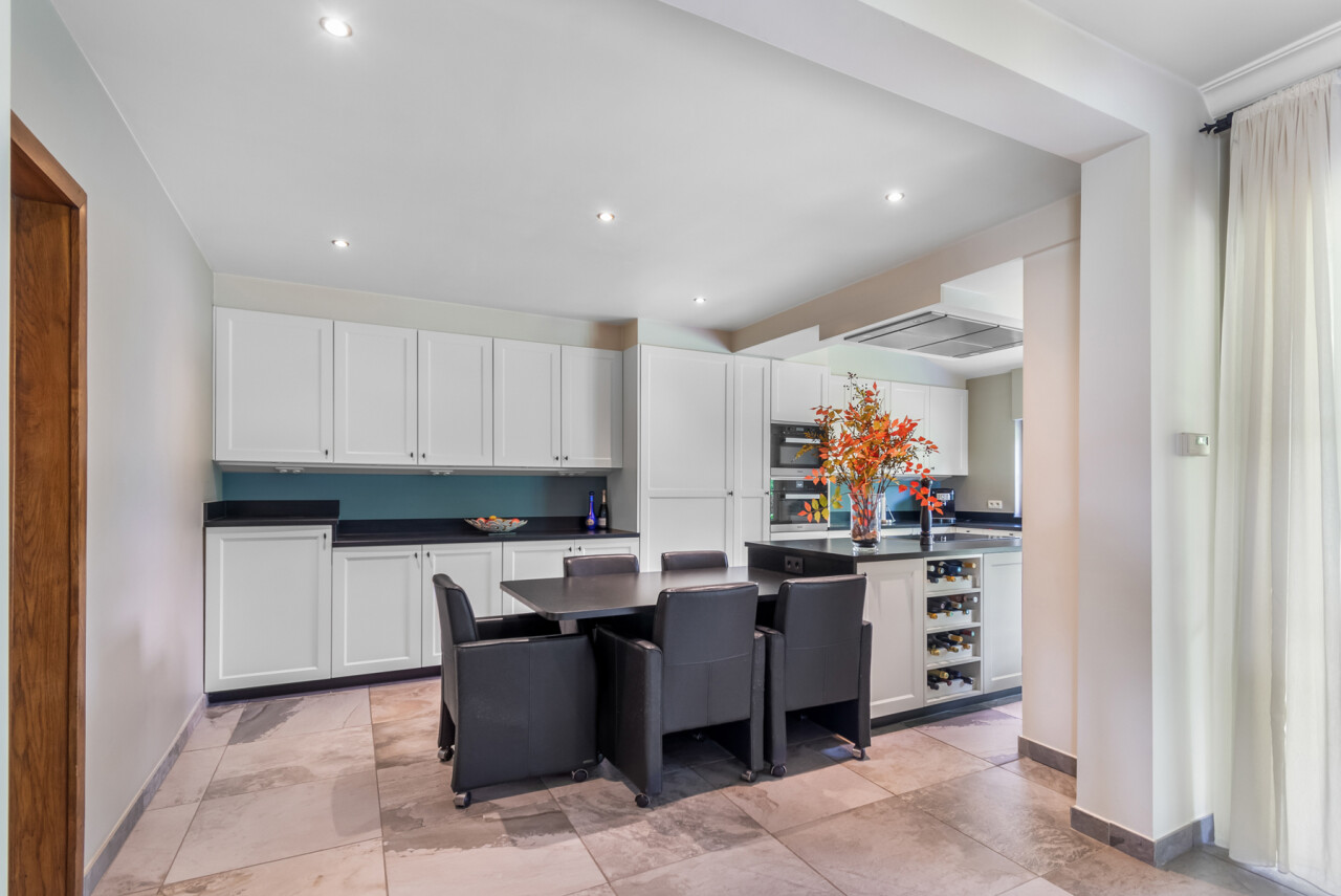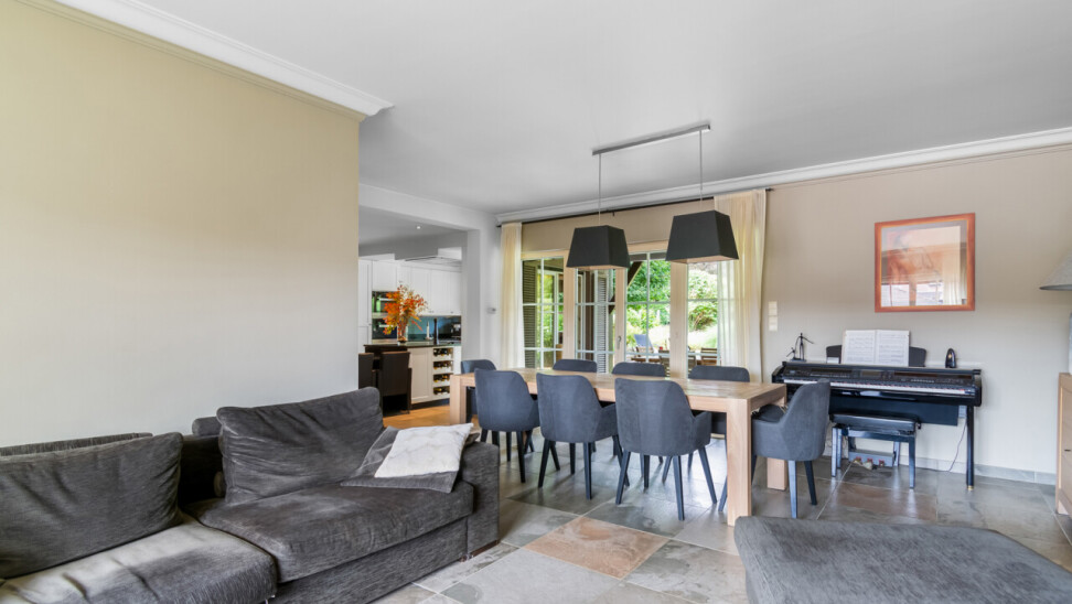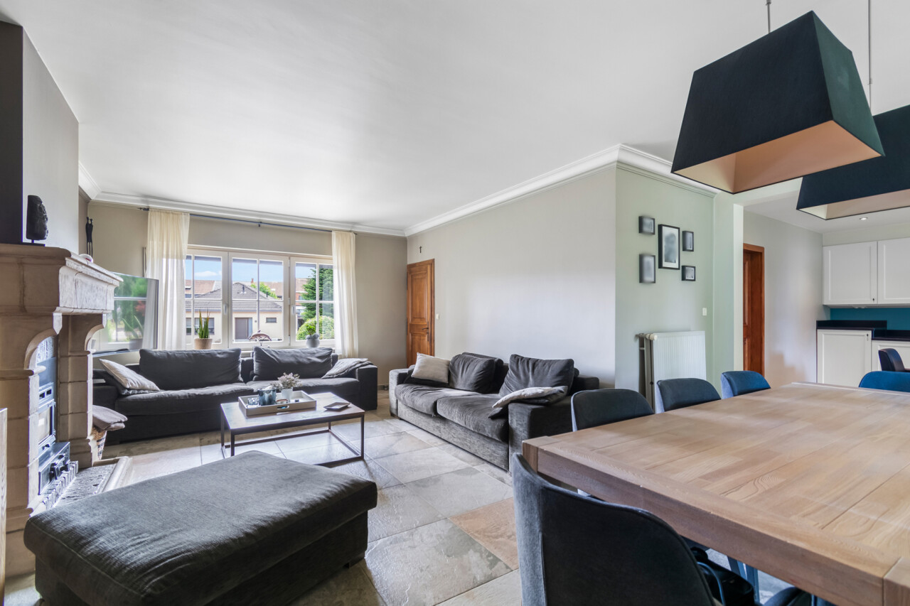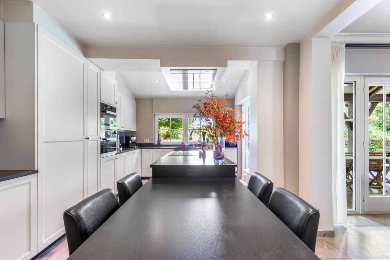 De vernieuwde keuken is uitgerust met kwalitatieve inbouwtoestellen en afgewerkt met duurzame materialen. Deze keuken vormt het hart van de woning en beschikt bovendien over een toegang tot de tuin en het overdekte terras. De leefruimte staat in directe verbinding met de keuken en is ingedeeld in een gezellige zit- en eethoek.