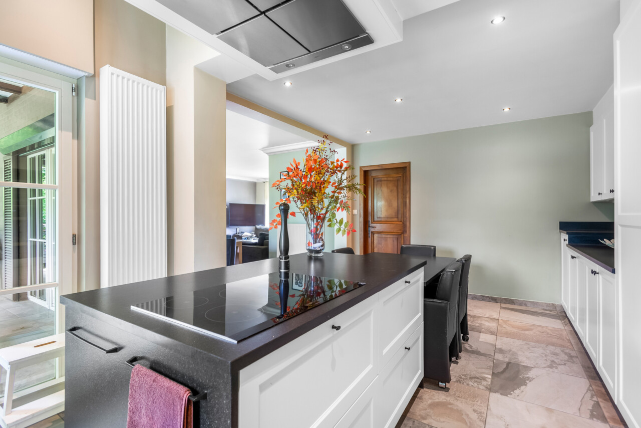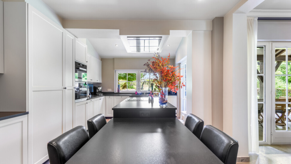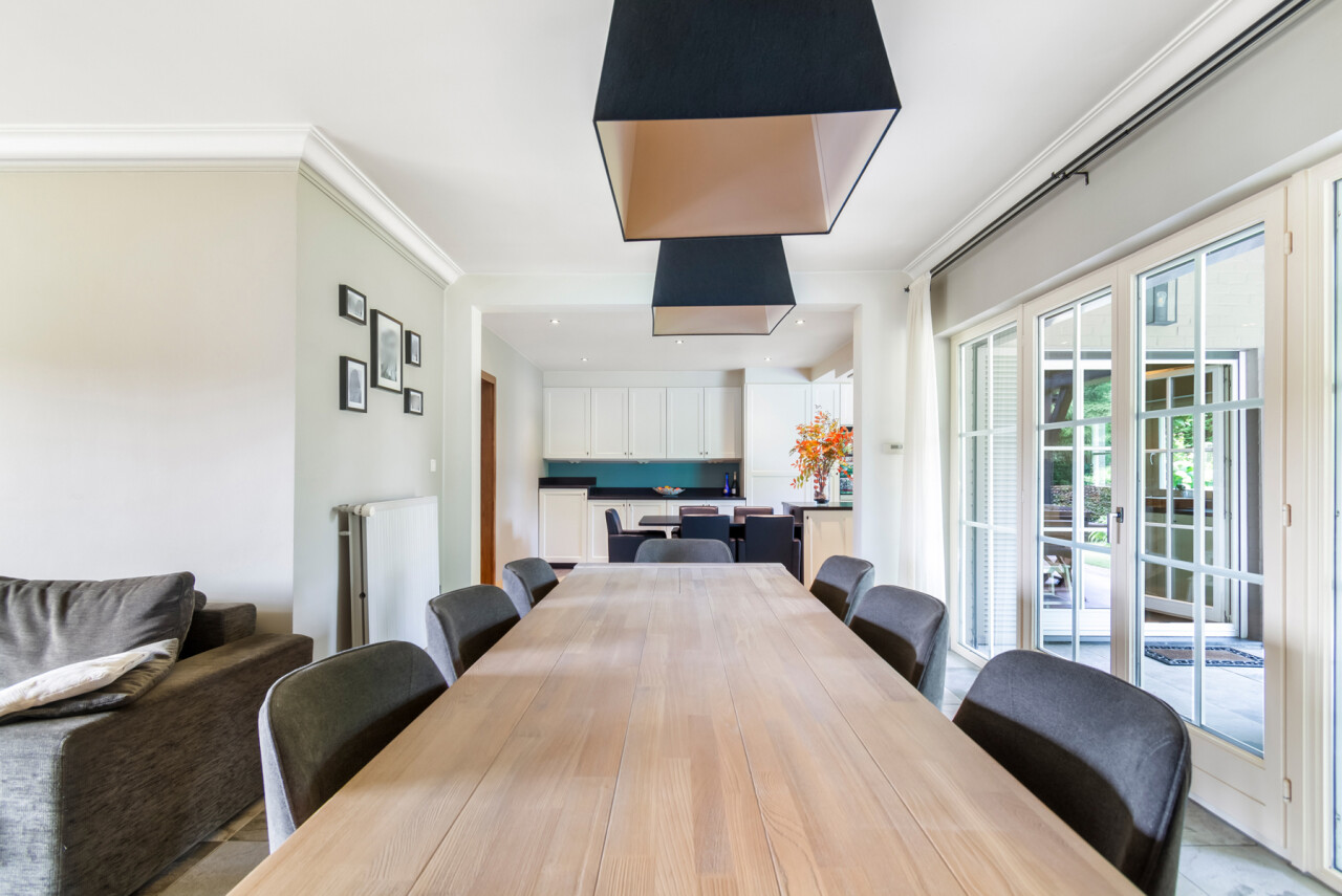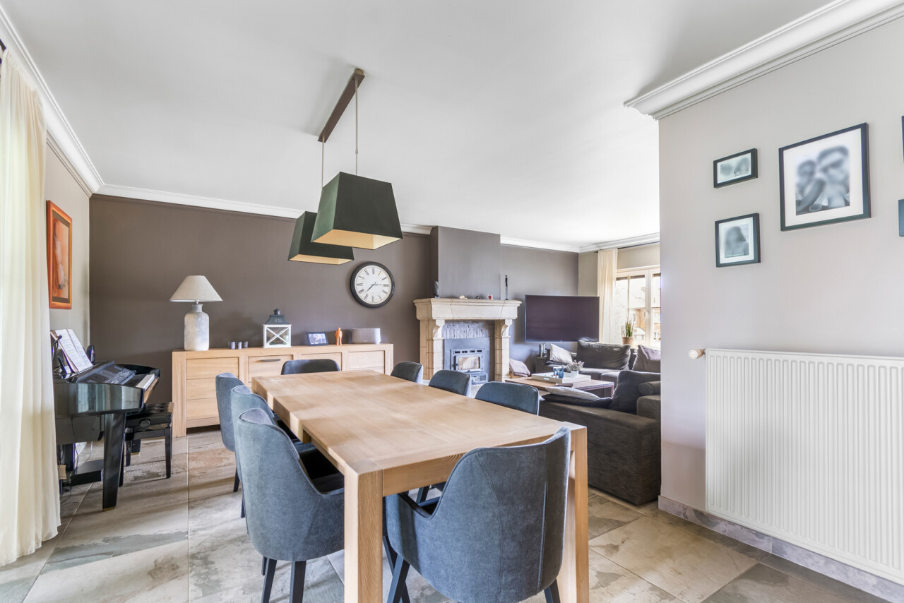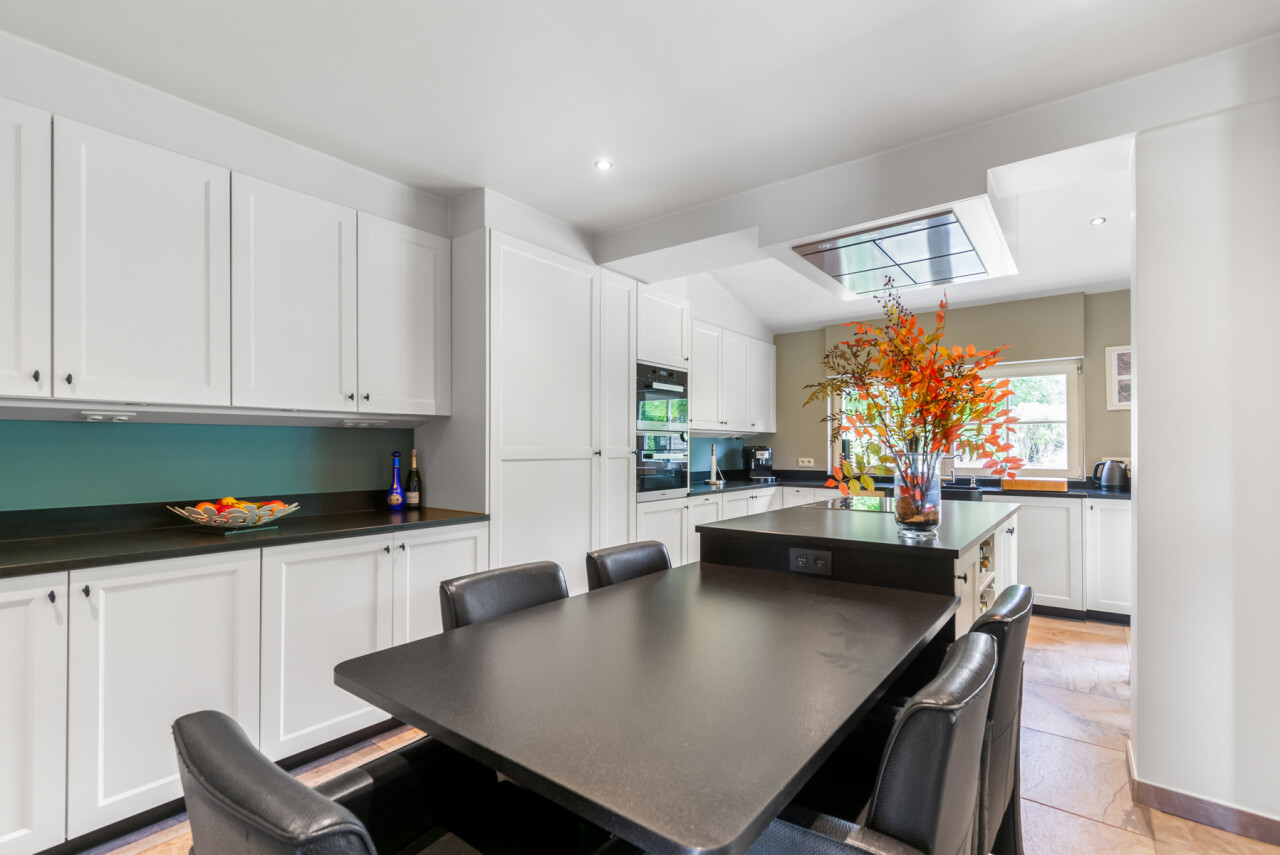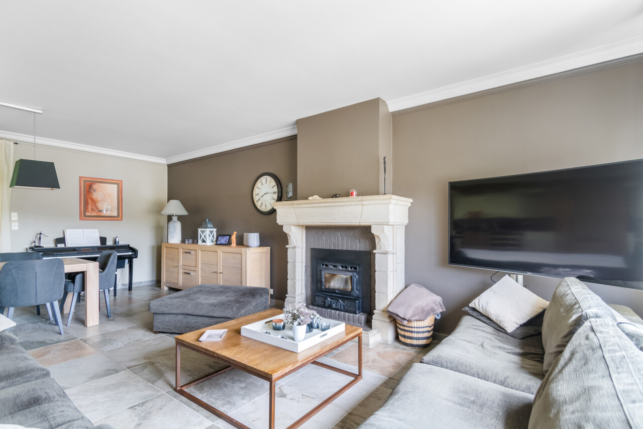 De vernieuwde keuken is uitgerust met kwalitatieve inbouwtoestellen en afgewerkt met duurzame materialen. Deze keuken vormt het hart van de woning en beschikt bovendien over een toegang tot de tuin en het overdekte terras. De leefruimte staat in directe verbinding met de keuken en is ingedeeld in een gezellige zit- en eethoek.