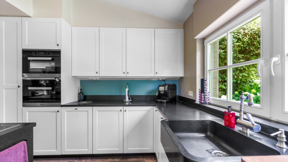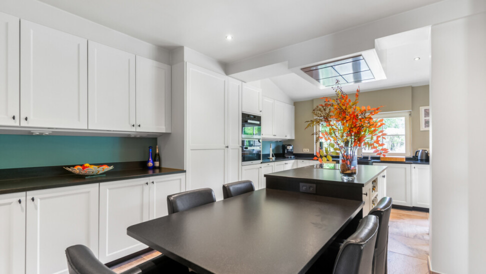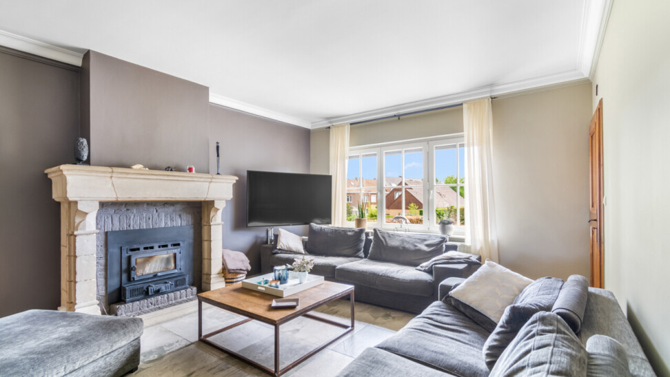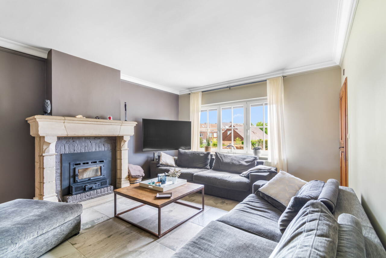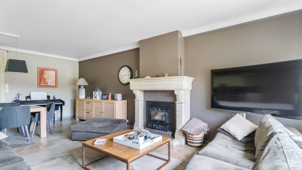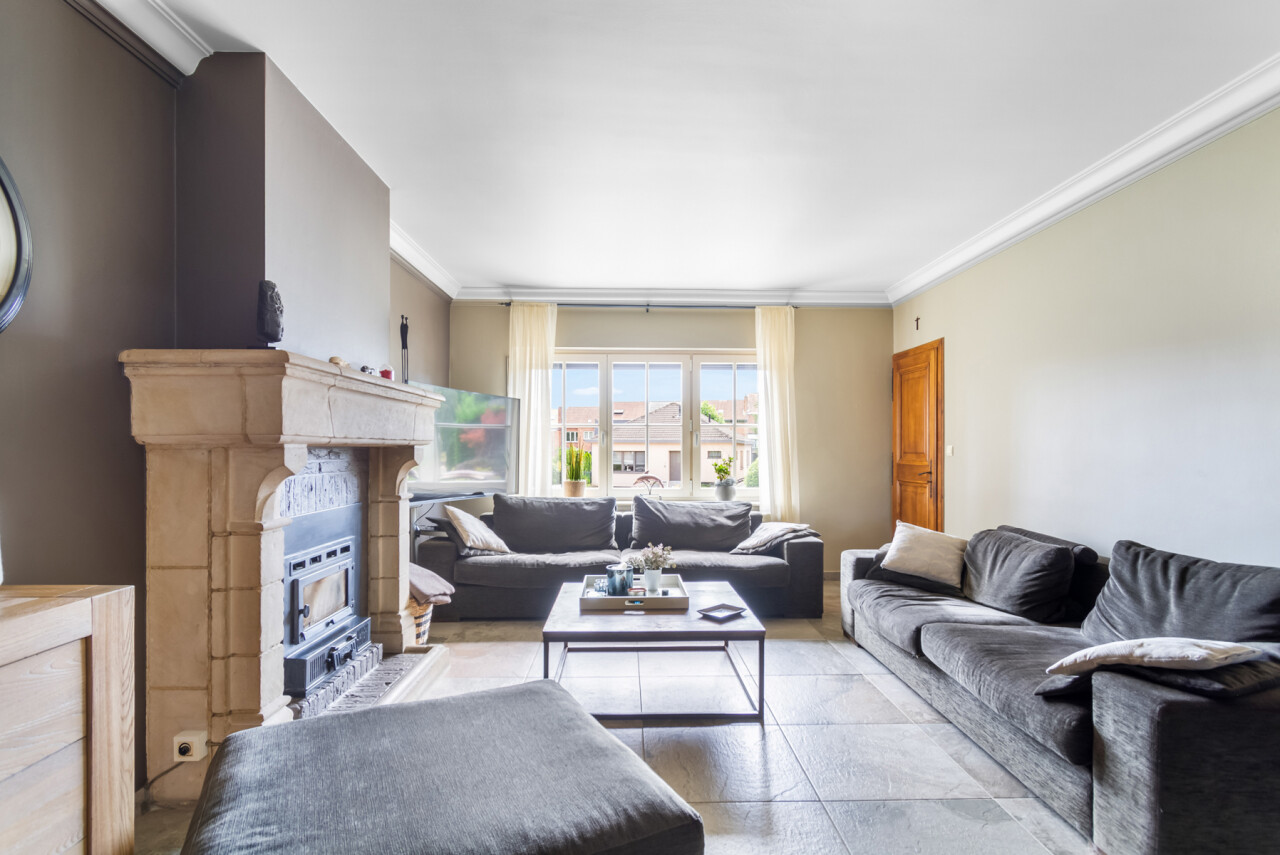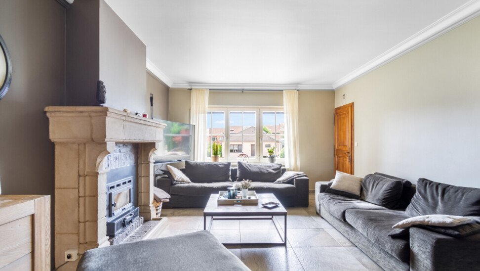 De vernieuwde keuken is uitgerust met kwalitatieve inbouwtoestellen en afgewerkt met duurzame materialen. Deze keuken vormt het hart van de woning en beschikt bovendien over een toegang tot de tuin en het overdekte terras. De leefruimte staat in directe verbinding met de keuken en is ingedeeld in een gezellige zit- en eethoek.