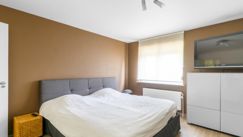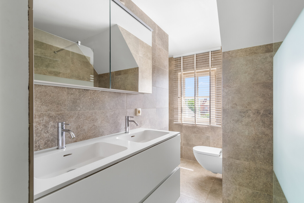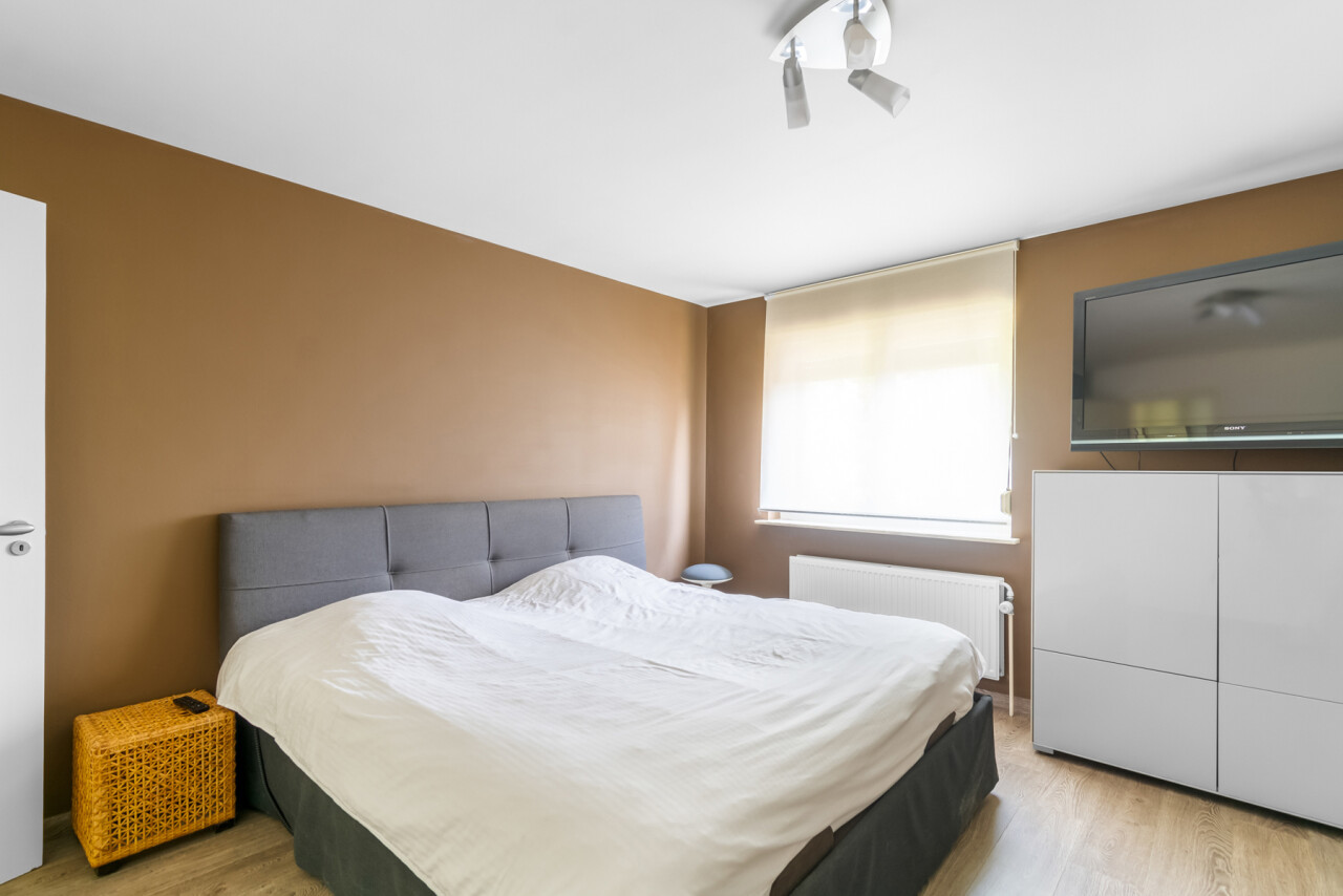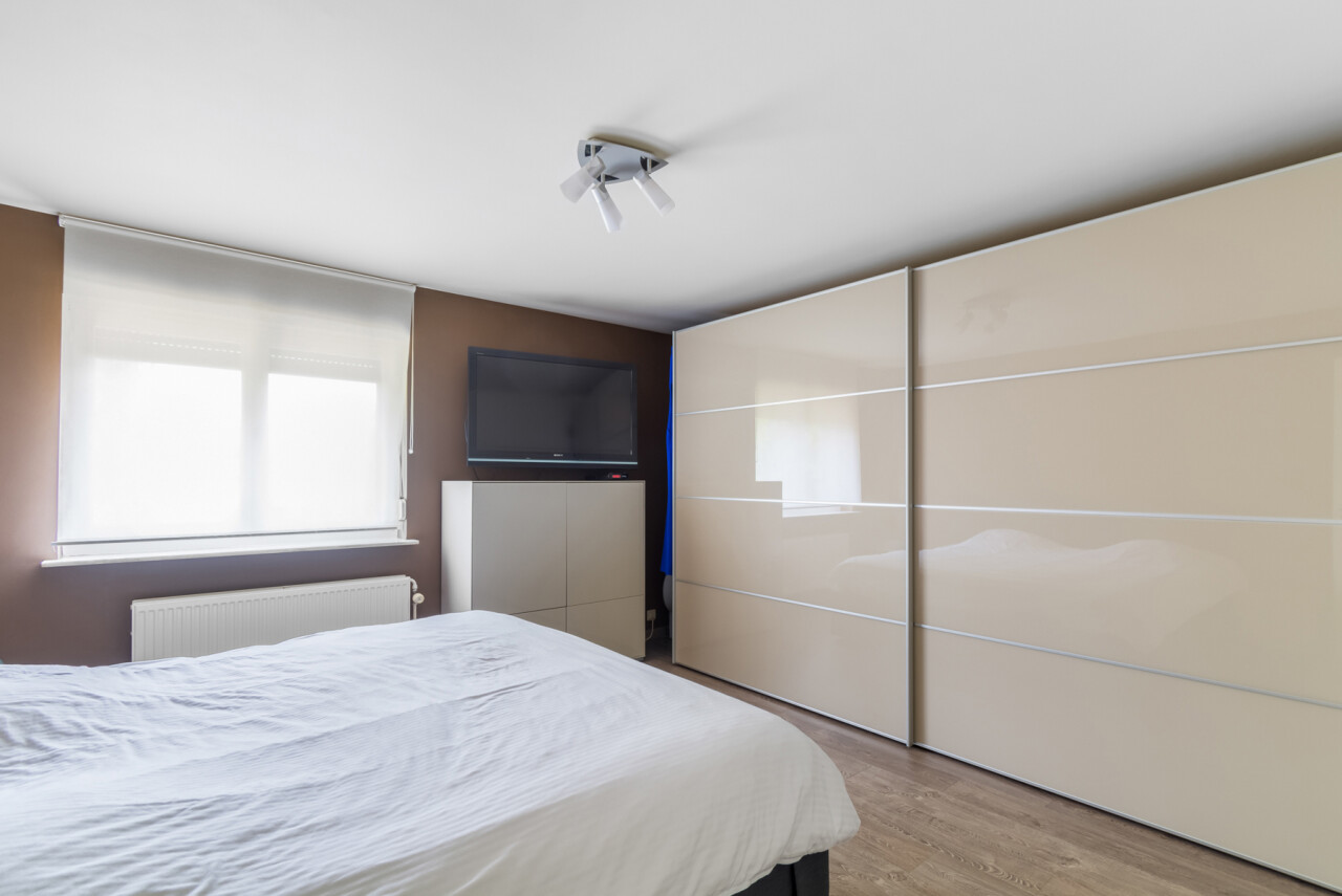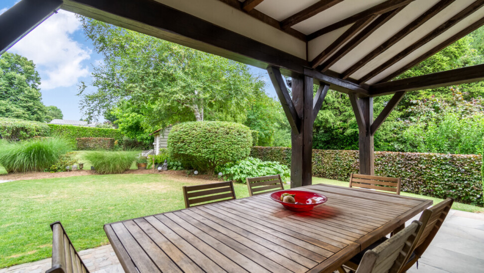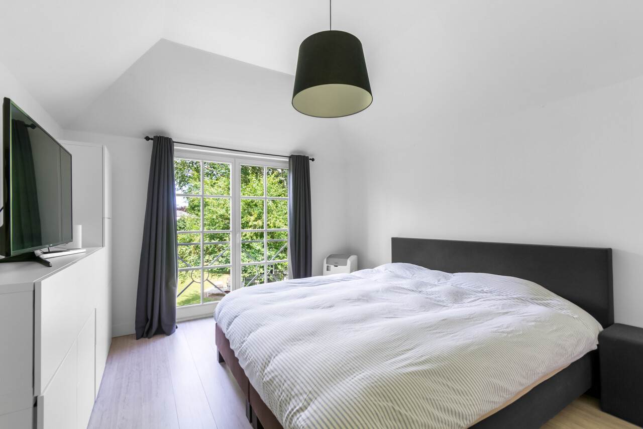 De vernieuwde keuken is uitgerust met kwalitatieve inbouwtoestellen en afgewerkt met duurzame materialen. Deze keuken vormt het hart van de woning en beschikt bovendien over een toegang tot de tuin en het overdekte terras. De leefruimte staat in directe verbinding met de keuken en is ingedeeld in een gezellige zit- en eethoek.