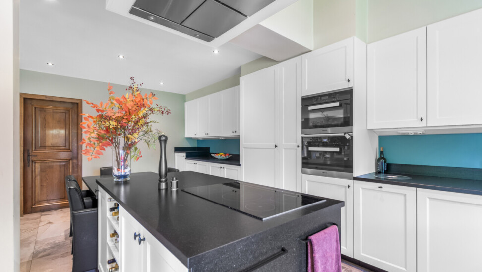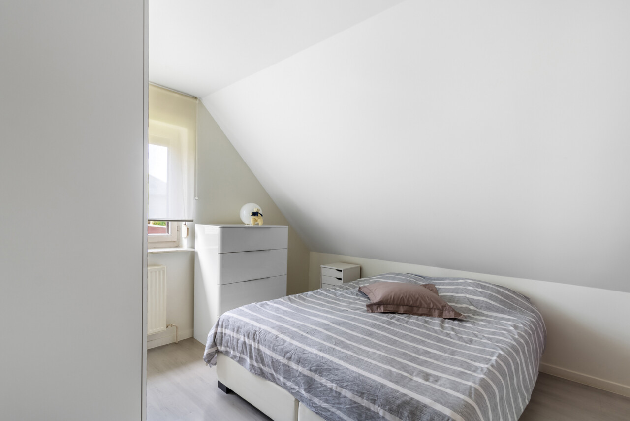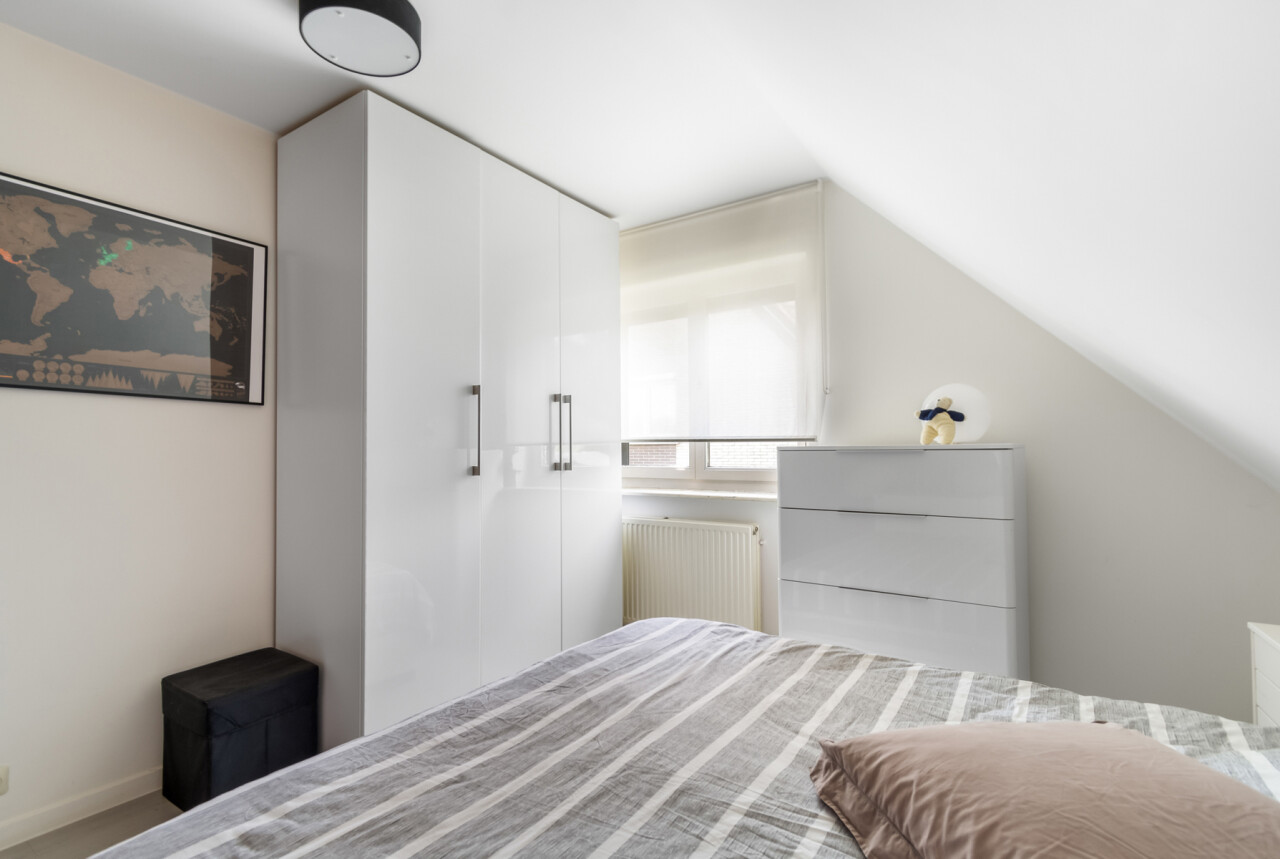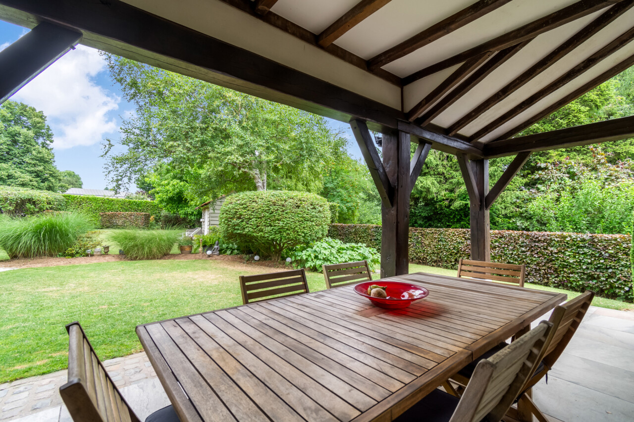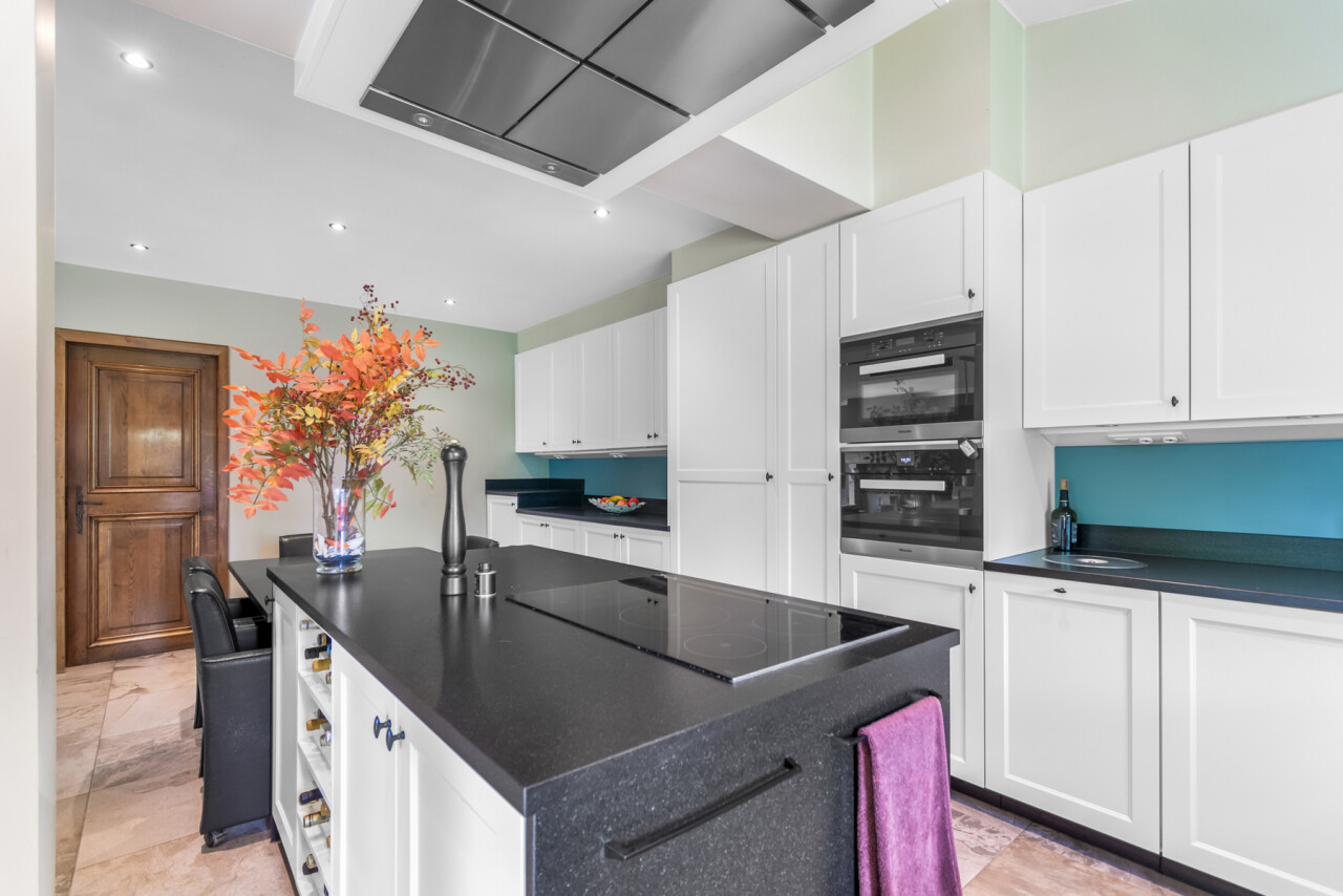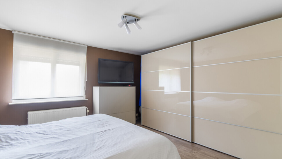 De vernieuwde keuken is uitgerust met kwalitatieve inbouwtoestellen en afgewerkt met duurzame materialen. Deze keuken vormt het hart van de woning en beschikt bovendien over een toegang tot de tuin en het overdekte terras. De leefruimte staat in directe verbinding met de keuken en is ingedeeld in een gezellige zit- en eethoek.