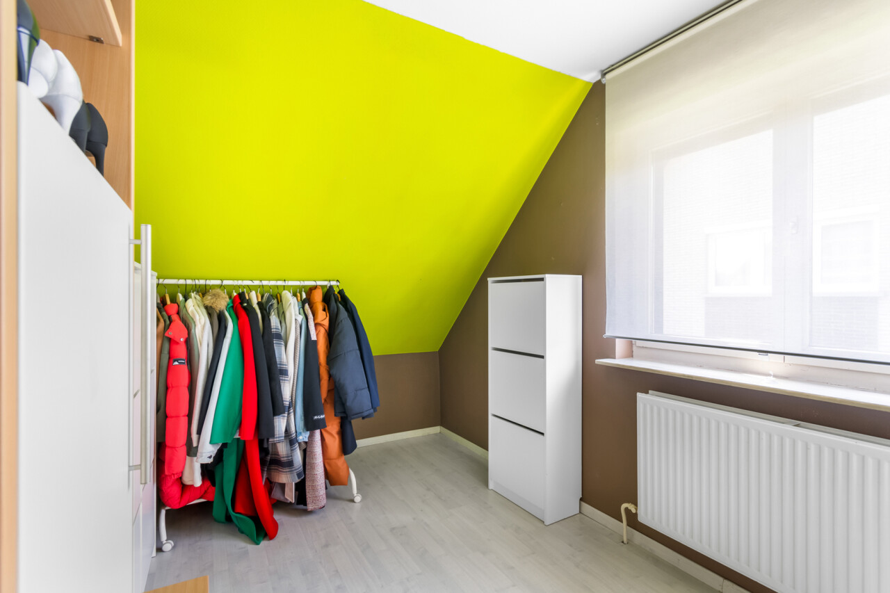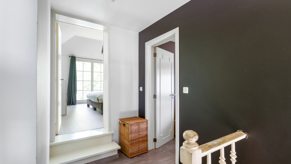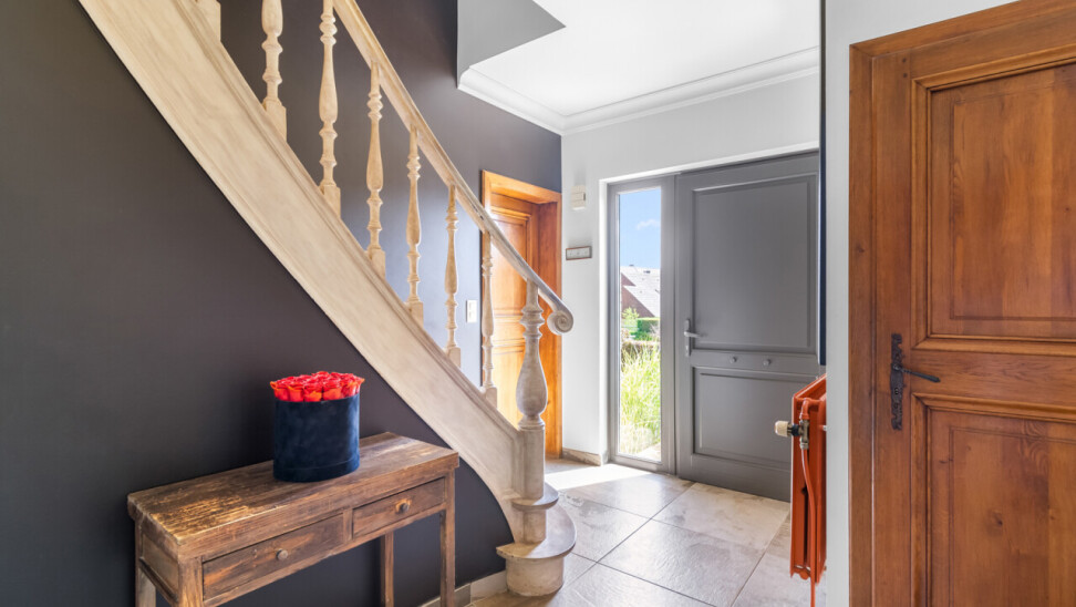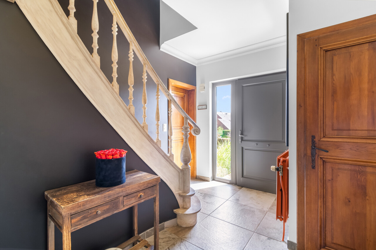 We betreden de villa langs de ruime, centrale inkomhal. Aan de linkerzijde bevindt zich een praktische bureauruimte, ideaal voor wie van thuis uit werkt of nood heeft aan een rustige studeer- of hobbykamer. Vanuit de hal is er een toegang naar de leefruimte, keuken en de trap naar de kelderverdieping.