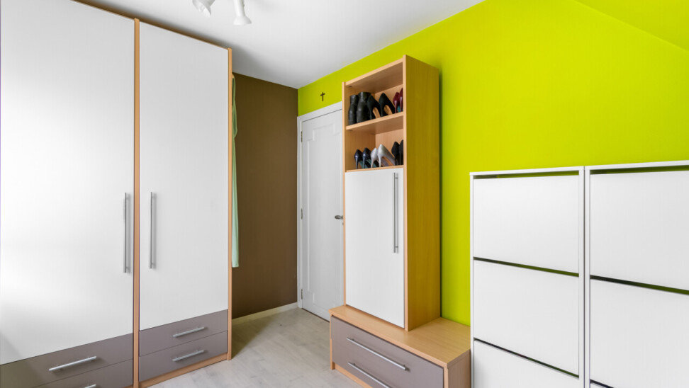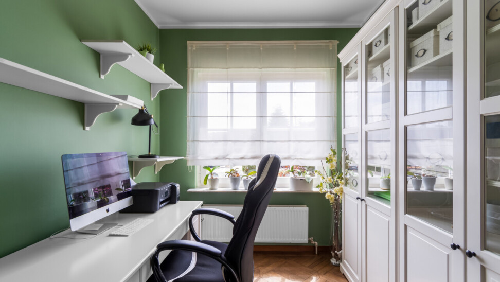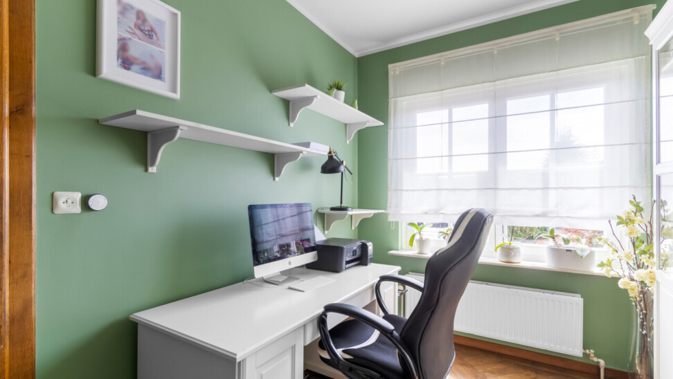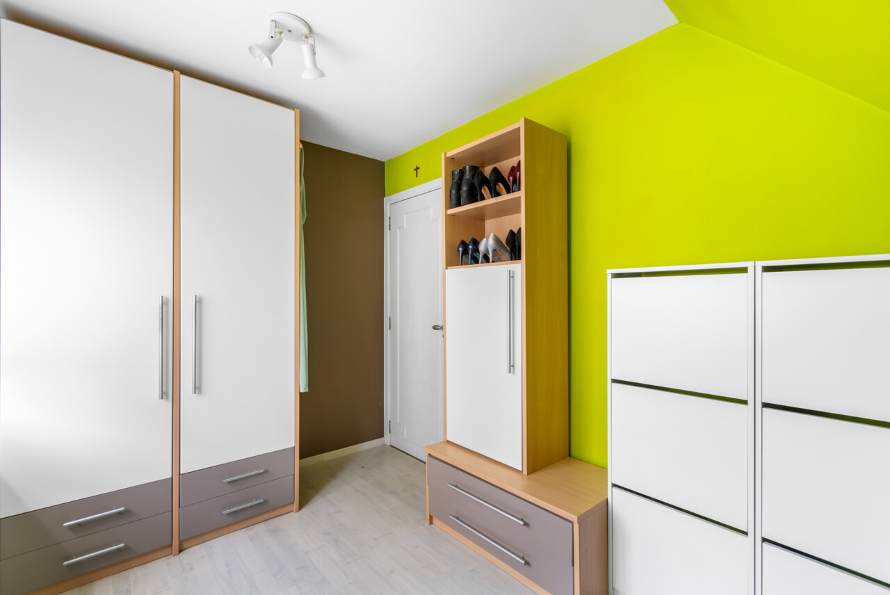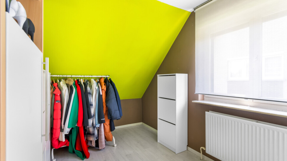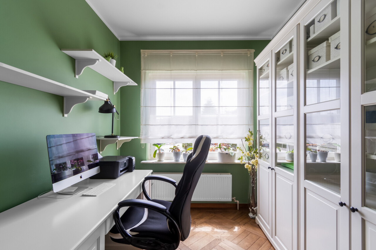We betreden de villa langs de ruime, centrale inkomhal. Aan de linkerzijde bevindt zich een praktische bureauruimte, ideaal voor wie van thuis uit werkt of nood heeft aan een rustige studeer- of hobbykamer. Vanuit de hal is er een toegang naar de leefruimte, keuken en de trap naar de kelderverdieping.
