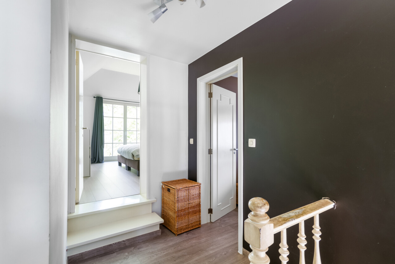 Via de trap in de hal bereiken we de eerste verdieping, waar zich 4 slaapkamers bevinden en de vernieuwde badkamer, voorzien van inloopdouche, dubbele wastafel en toilet. De ondergrondse verdieping herbergt een ruime garage die plaats biedt aan meerdere wagens en extra bergruimte. Verder bevinden zich hier nog twee kelders.