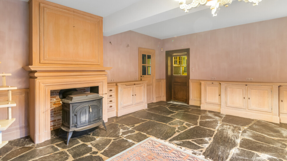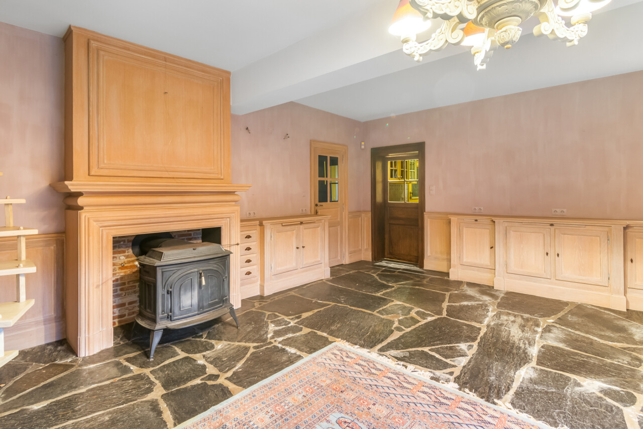 De inkomhal geeft toegang tot de verschillende ruimtes: een bureauruimte met aansluitend toilet, de ruime leefruimte en de keuken. De woonkamer is voorzien van massief parket en geniet van veel natuurlijk licht en een prachtig uitzicht op de tuin. Het aanpalende eetgedeelte heeft een natuurstenen vloer en volledig ingebouwde kasten. De originele open haarden zijn bewaard gebleven, wat bijdraagt aan de authentieke sfeer.