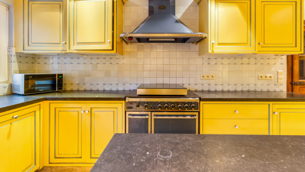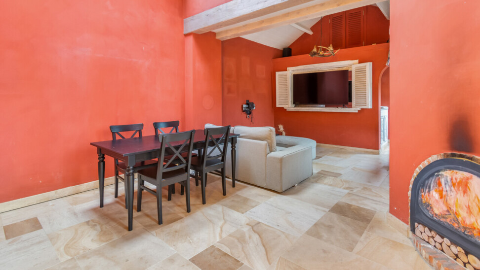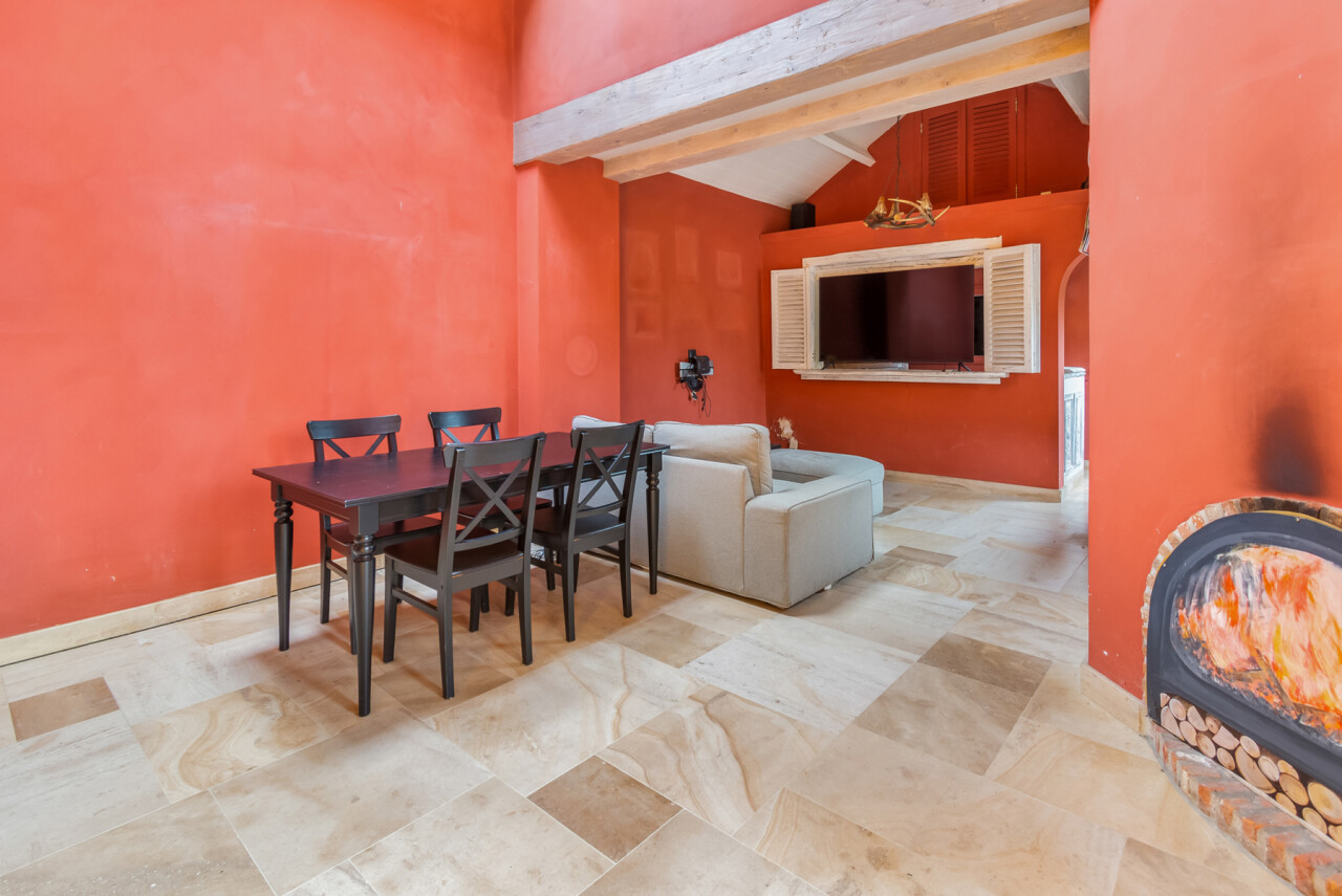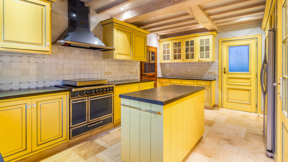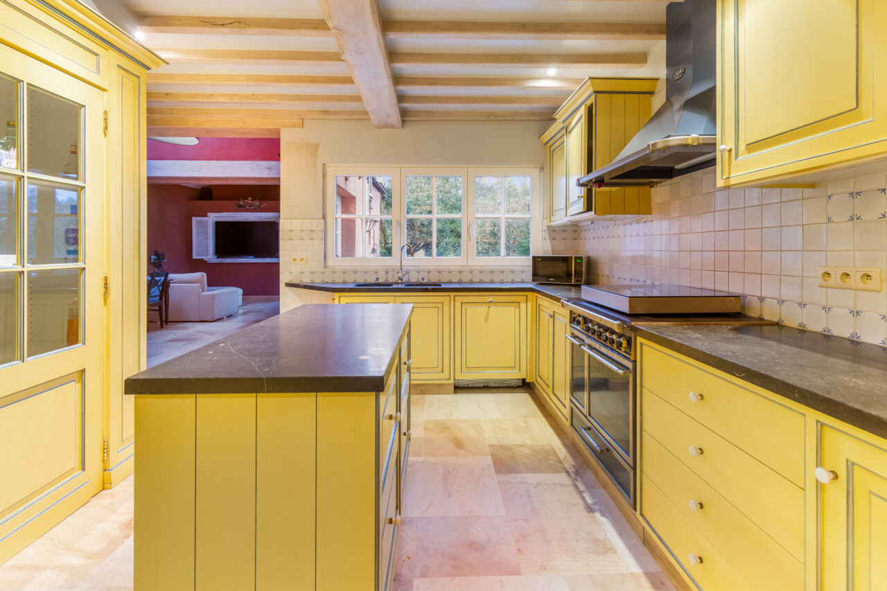De volledig ingerichte keuken beschikt over een ruime bijkeuken. Aansluitend is er een eetkamer met directe toegang tot het terras en een prachtig zicht op het zwembad.