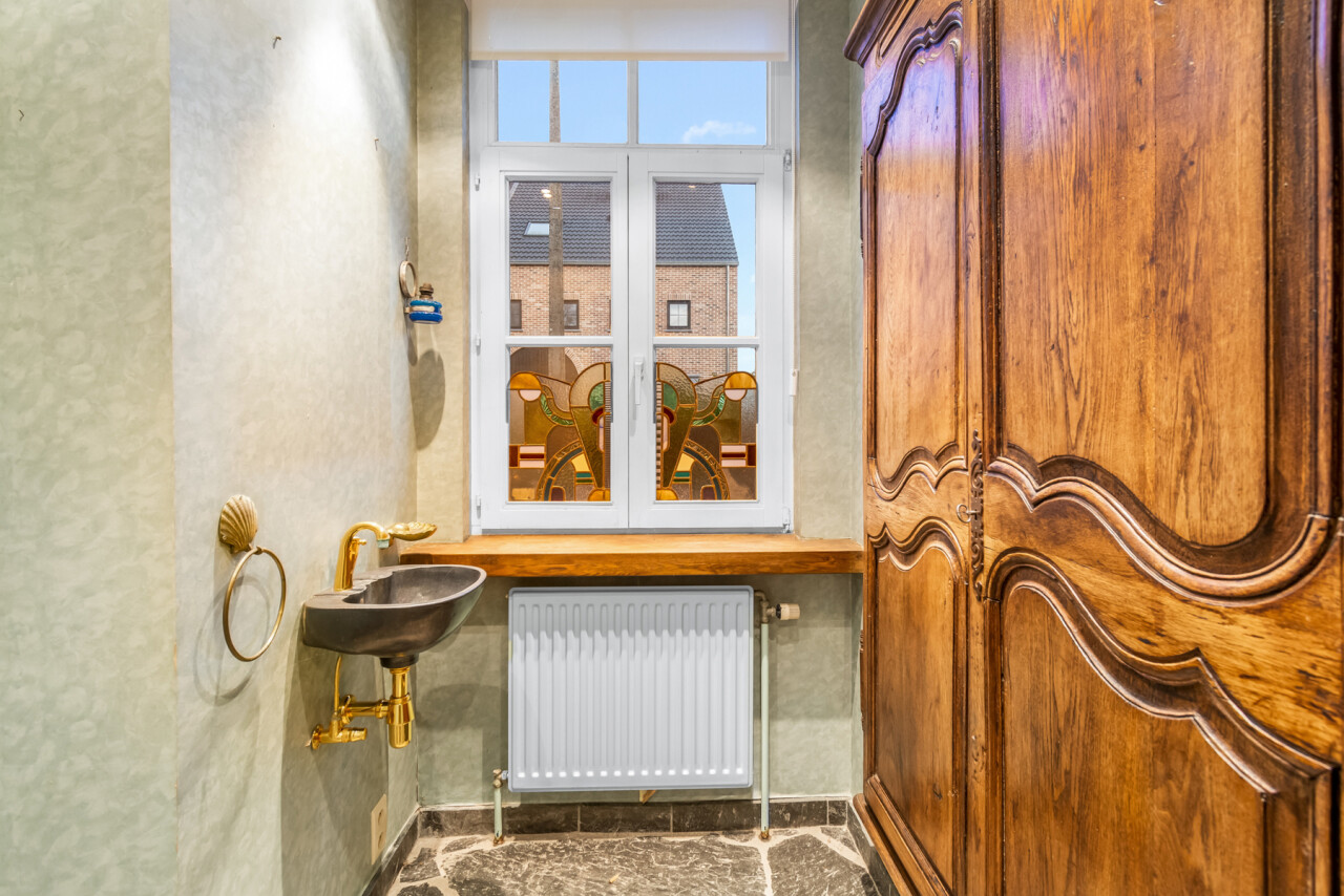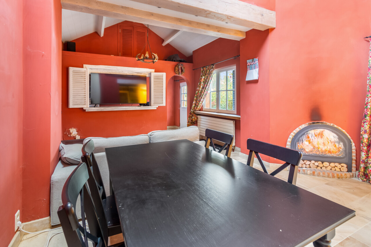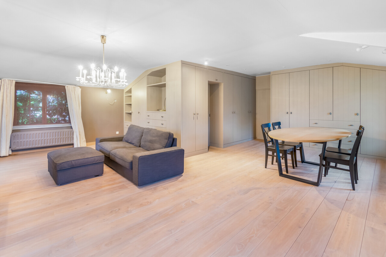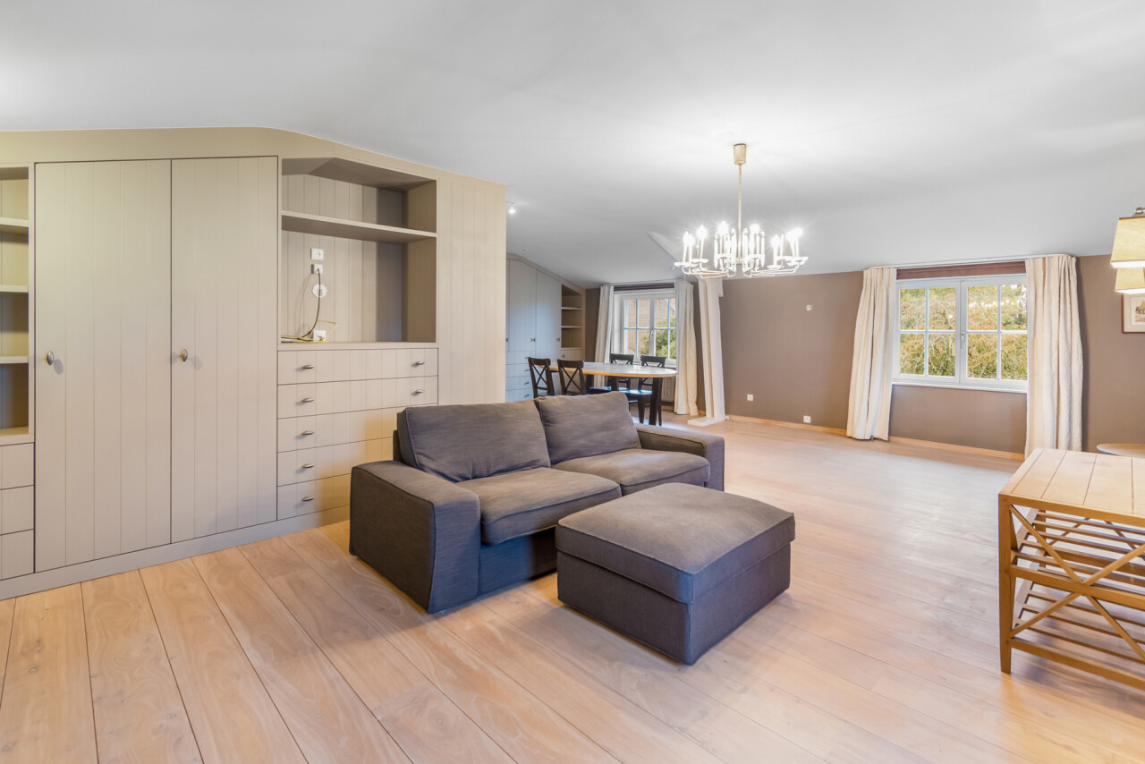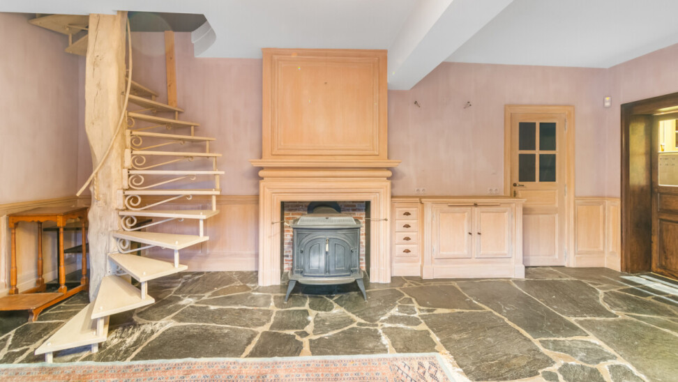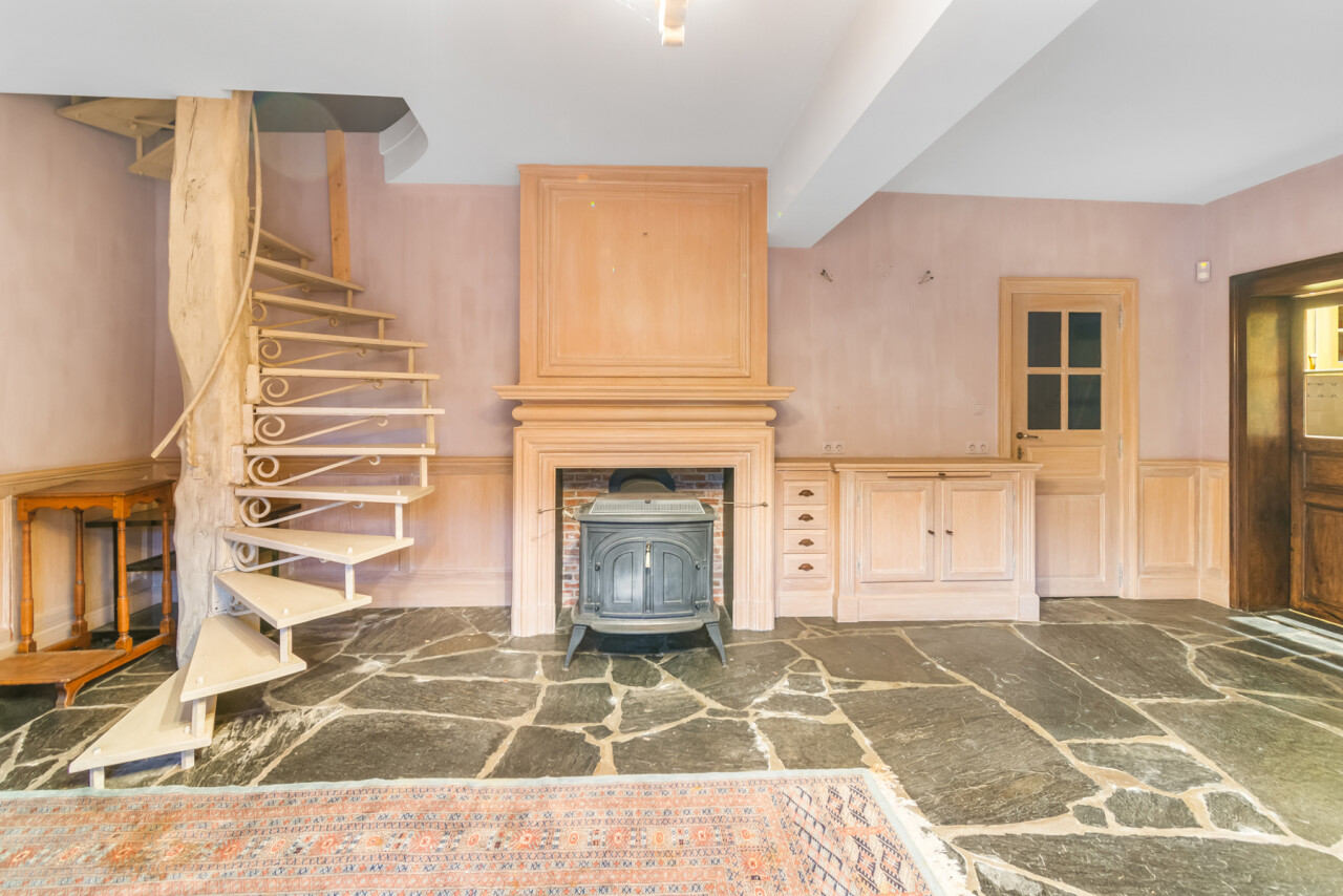 De inkomhal geeft toegang tot de verschillende ruimtes: een bureauruimte met aansluitend toilet, de ruime leefruimte en de keuken. De woonkamer is voorzien van massief parket en geniet van veel natuurlijk licht en een prachtig uitzicht op de tuin. Het aanpalende eetgedeelte heeft een natuurstenen vloer en volledig ingebouwde kasten. De originele open haarden zijn bewaard gebleven, wat bijdraagt aan de authentieke sfeer.