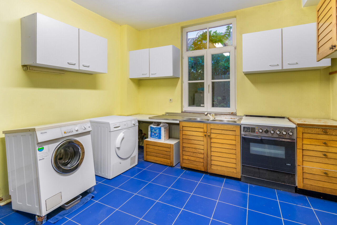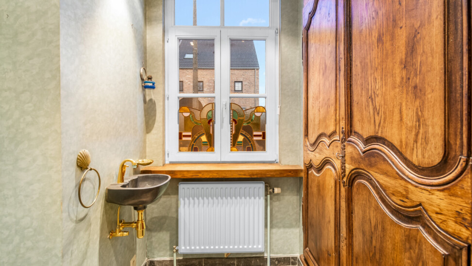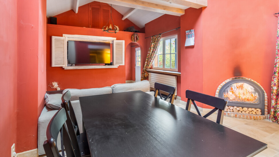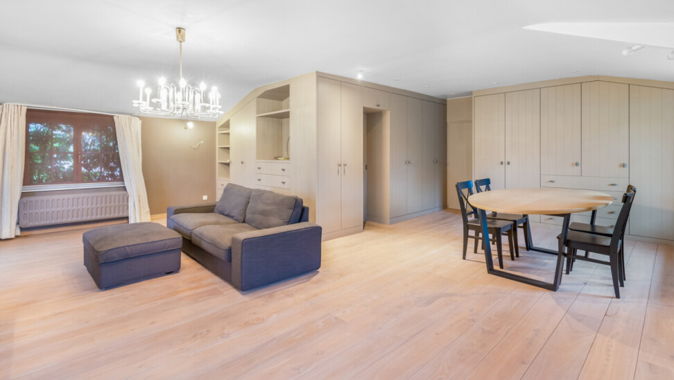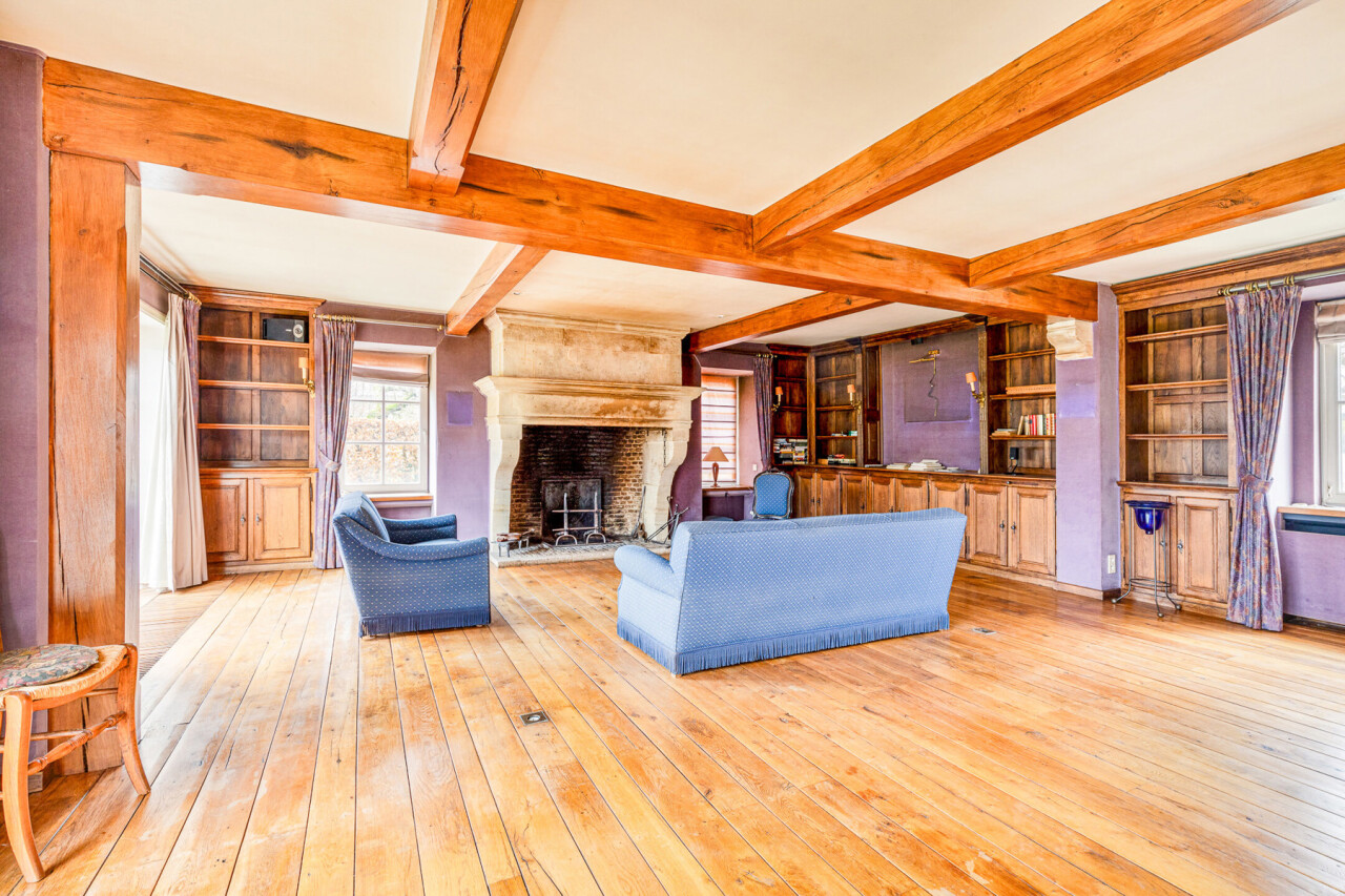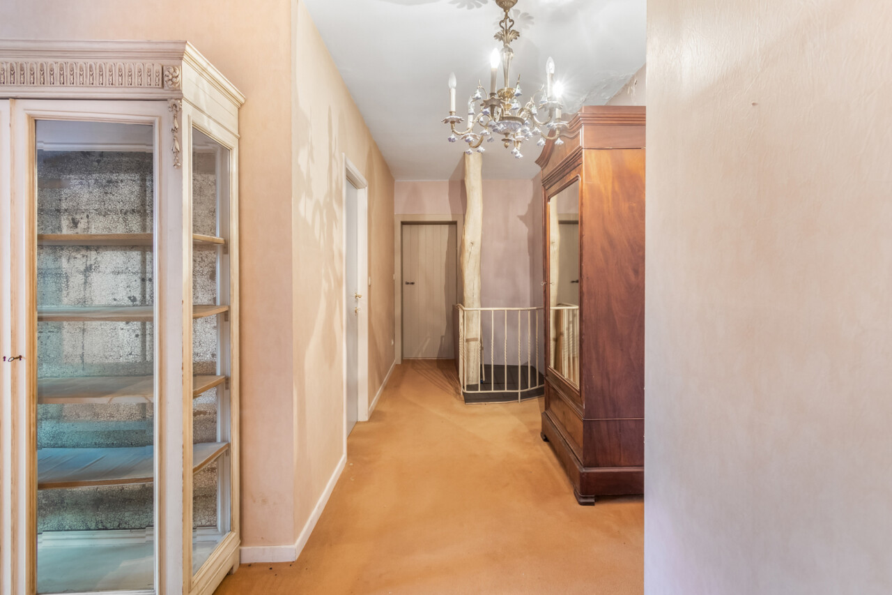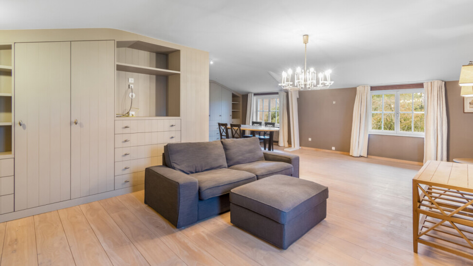De inkomhal geeft toegang tot de verschillende ruimtes: een bureauruimte met aansluitend toilet, de ruime leefruimte en de keuken. De woonkamer is voorzien van massief parket en geniet van veel natuurlijk licht en een prachtig uitzicht op de tuin. Het aanpalende eetgedeelte heeft een natuurstenen vloer en volledig ingebouwde kasten. De originele open haarden zijn bewaard gebleven, wat bijdraagt aan de authentieke sfeer.
