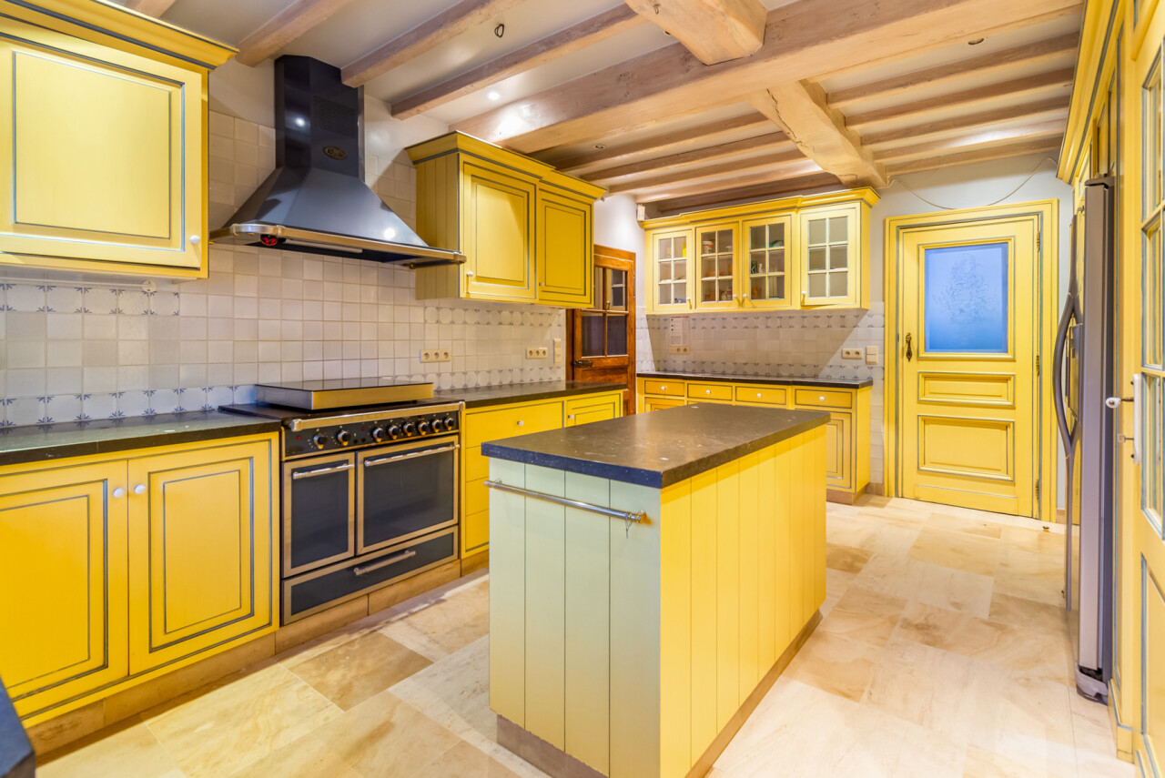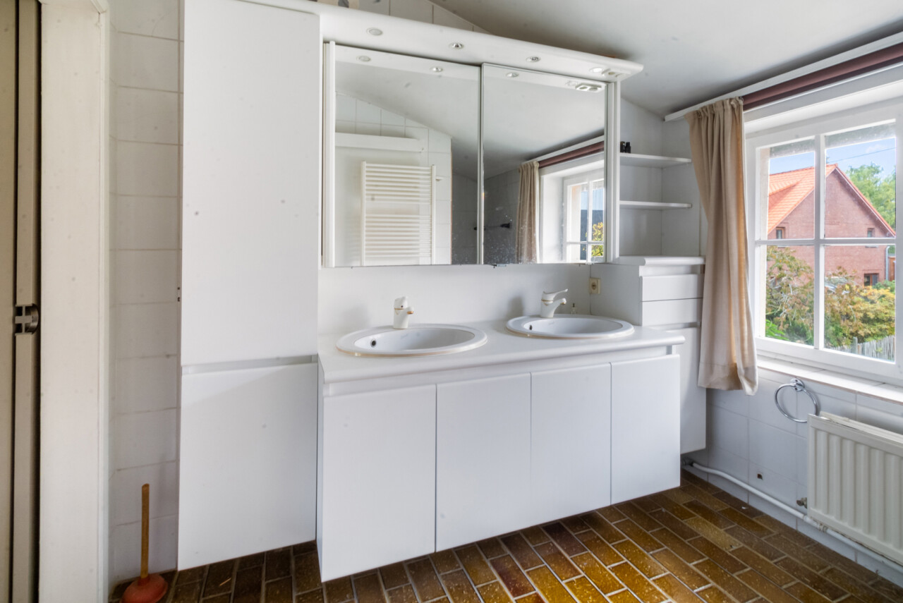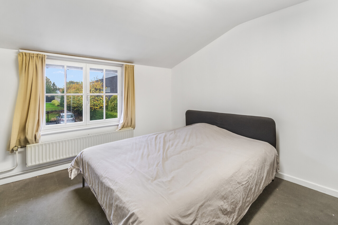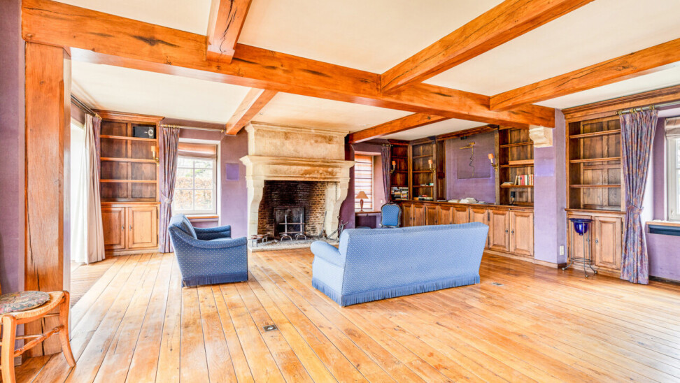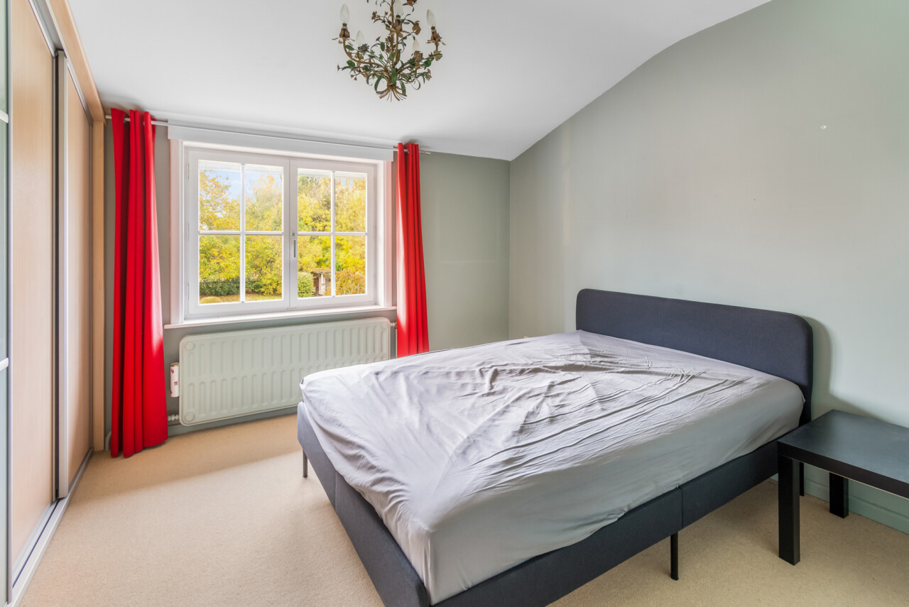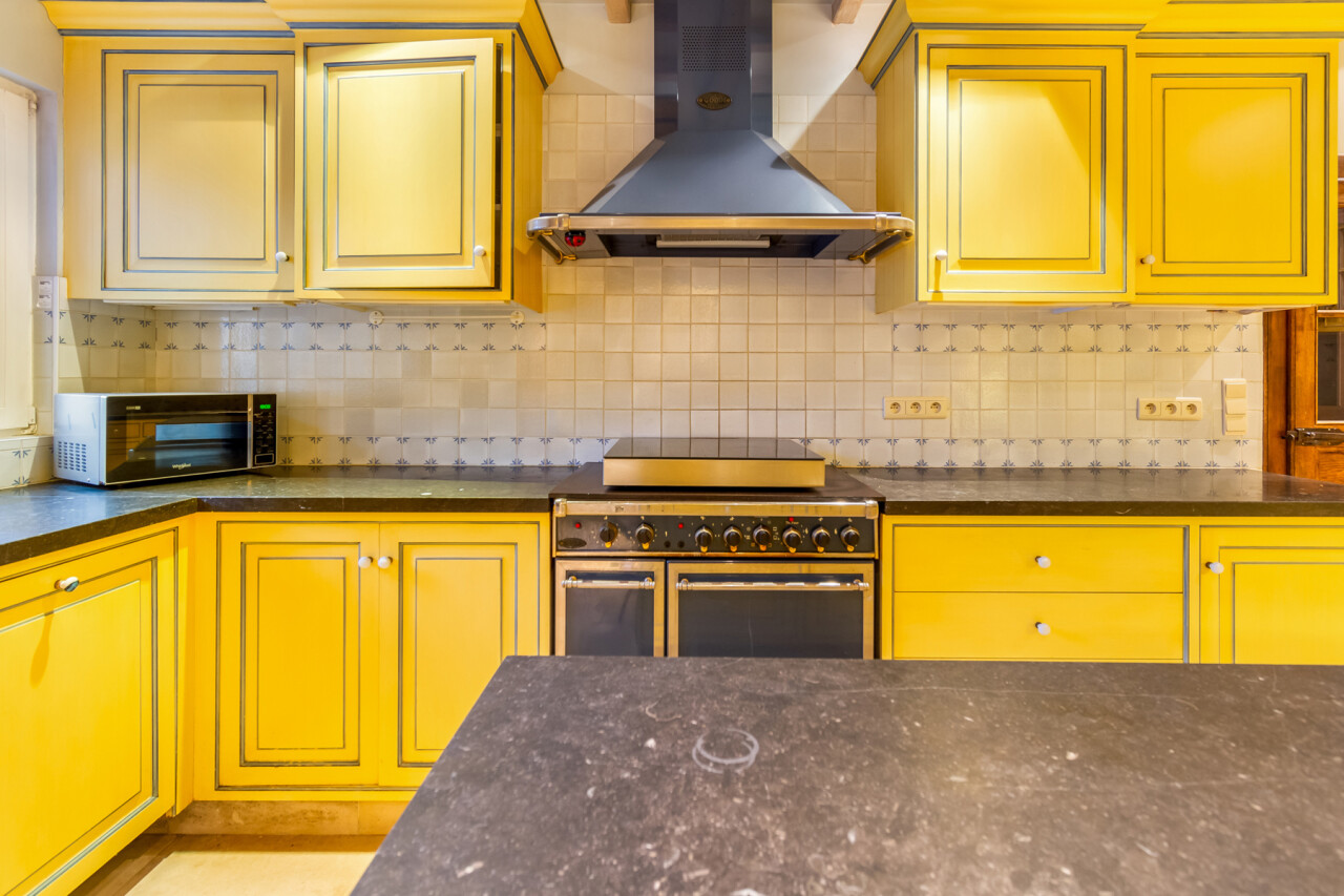 De inkomhal geeft toegang tot de verschillende ruimtes: een bureauruimte met aansluitend toilet, de ruime leefruimte en de keuken. De woonkamer is voorzien van massief parket en geniet van veel natuurlijk licht en een prachtig uitzicht op de tuin. Het aanpalende eetgedeelte heeft een natuurstenen vloer en volledig ingebouwde kasten. De originele open haarden zijn bewaard gebleven, wat bijdraagt aan de authentieke sfeer.