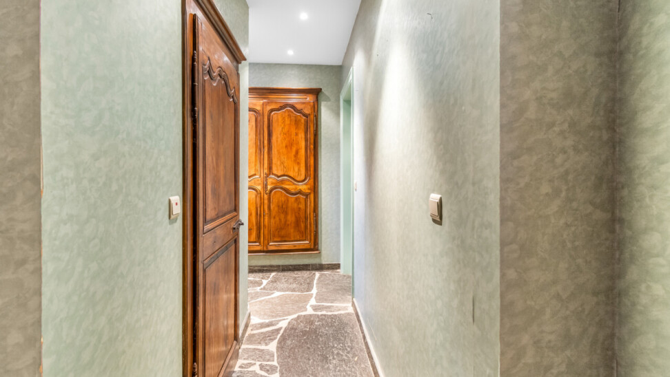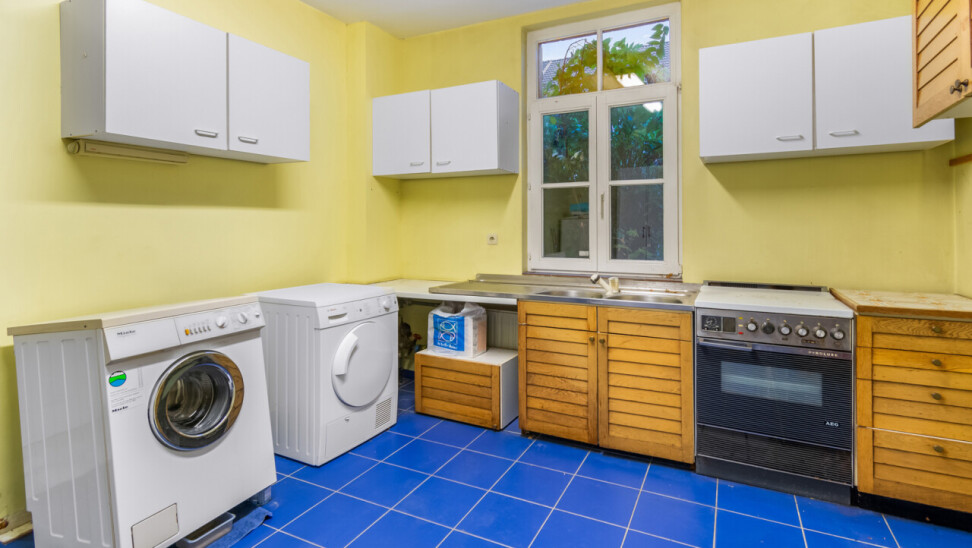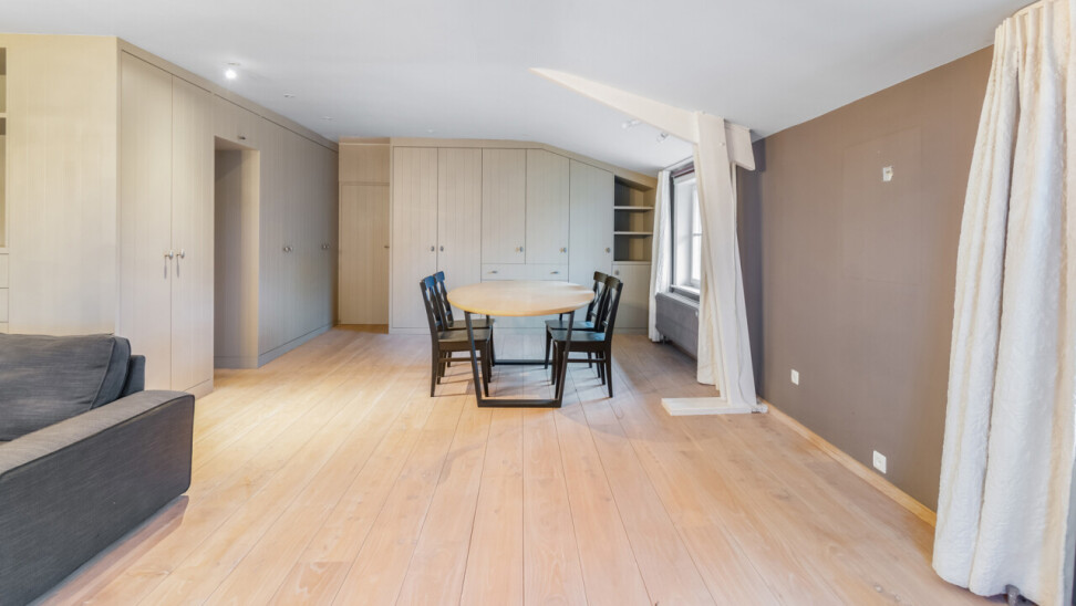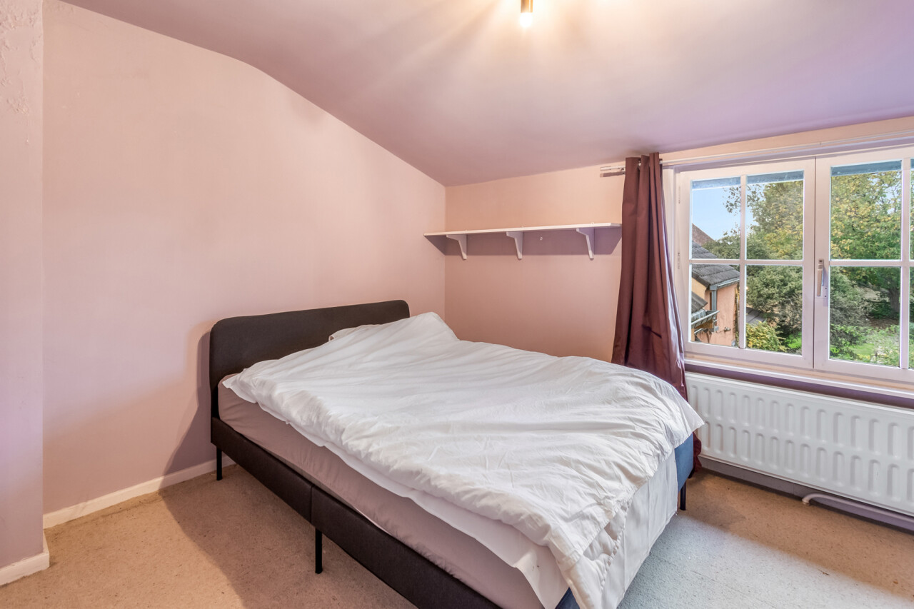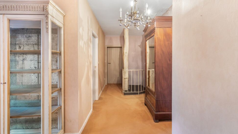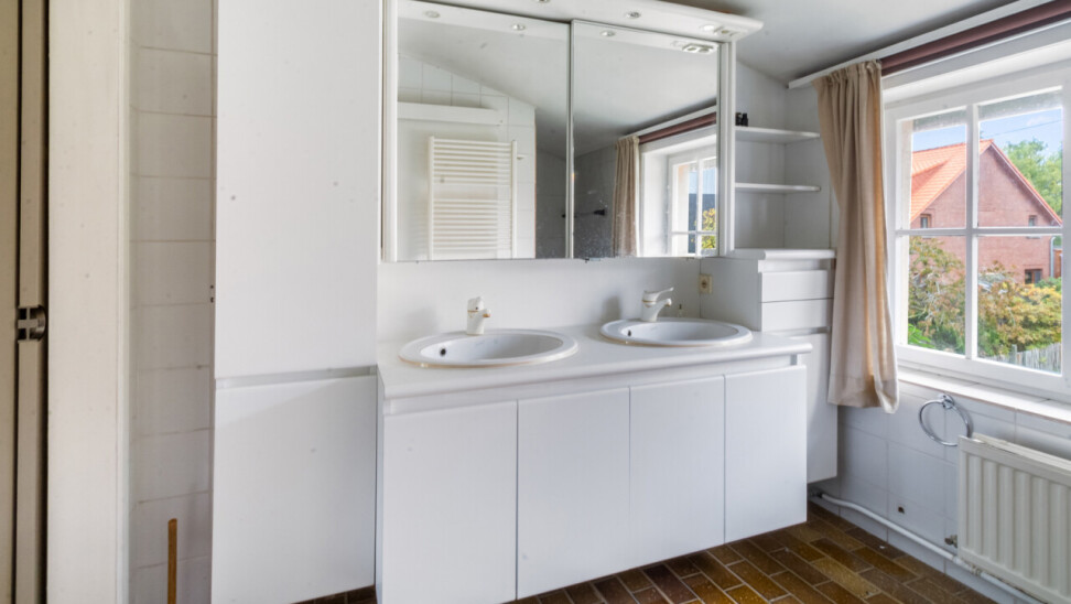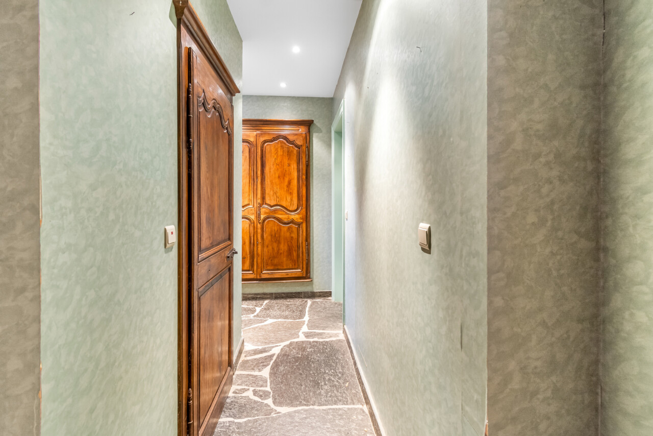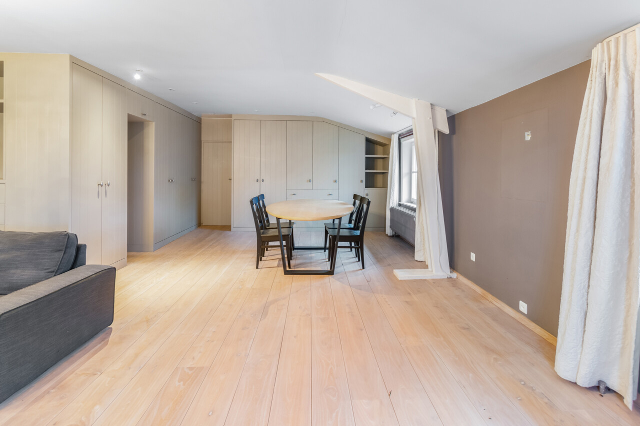 De inkomhal geeft toegang tot de verschillende ruimtes: een bureauruimte met aansluitend toilet, de ruime leefruimte en de keuken. De woonkamer is voorzien van massief parket en geniet van veel natuurlijk licht en een prachtig uitzicht op de tuin. Het aanpalende eetgedeelte heeft een natuurstenen vloer en volledig ingebouwde kasten. De originele open haarden zijn bewaard gebleven, wat bijdraagt aan de authentieke sfeer.